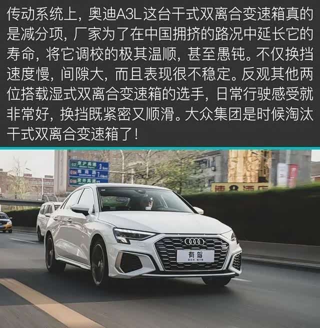 值得一说,三款车型都搭载了7速双离合变速箱,但是奥迪A3L为干式双离合,奔驰和宝马为湿式双离合。这也是奥迪A3L的“隐患”之一,传动系统是我们本期重点体验的部分。