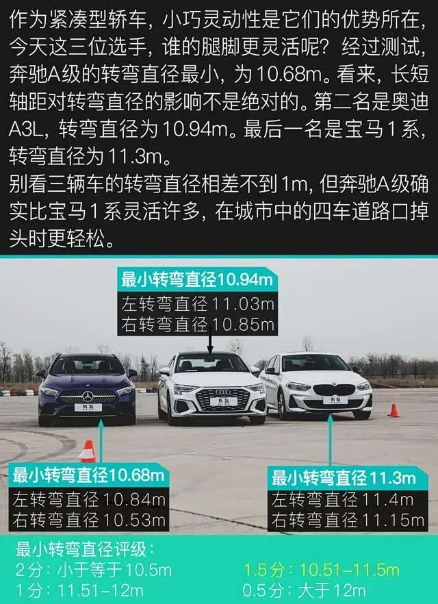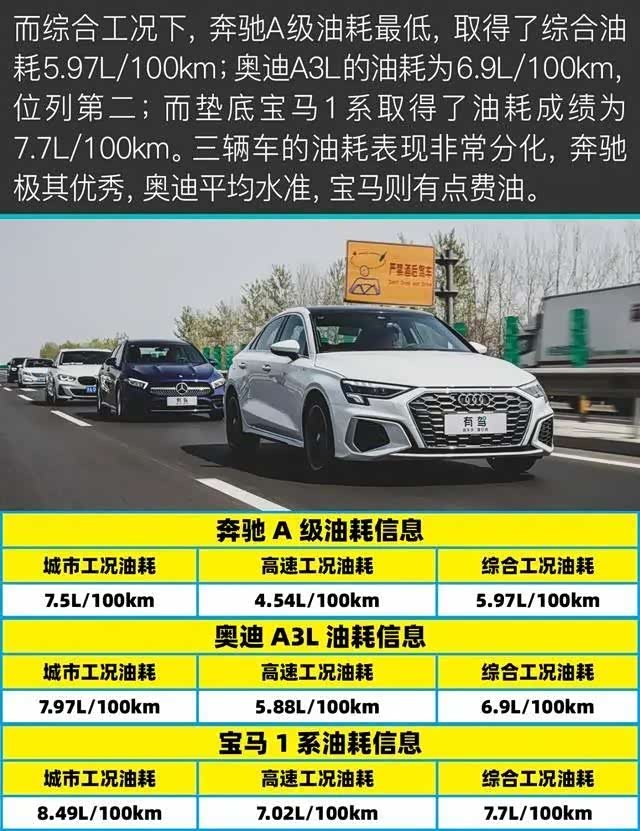 经过测试,无论是城市工况还是高速工况,奔驰A级的油耗都是最低的,宝马都是最高的,而奥迪居中。