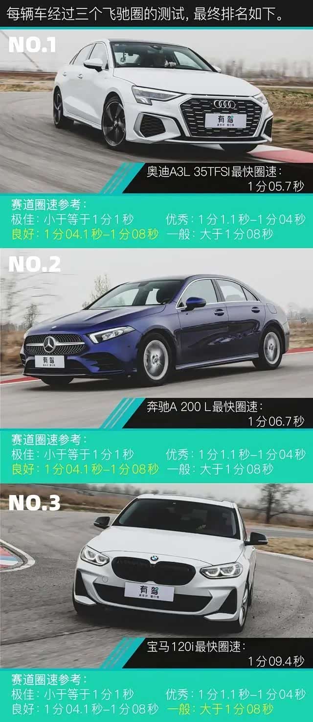 比起基础性能测试,赛道会更加综合考量三台车的整车性能。这三款车的赛道比拼可以说充满悬念,奔驰A级的动力最强,奥迪A3L的轮胎抓地力最好,宝马1系动力传动匹配最好。这三位所擅长的三个素质上,对于赛道驾驶,哪个都是不可或缺的。谁会是最终赢家呢?