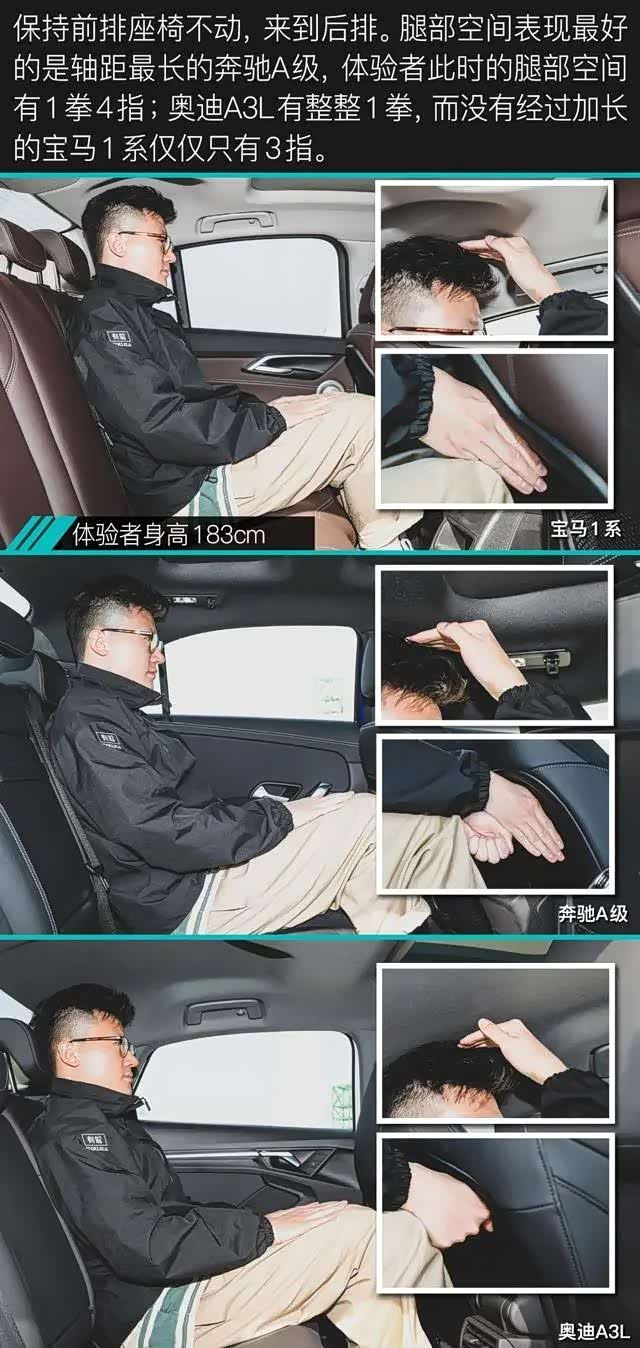 对于183cm的体验者而言,虽然三辆车的后排头部空间表现都很局促。但矮子里拔将军,后排头部空间表现最好的是奥迪A3L。