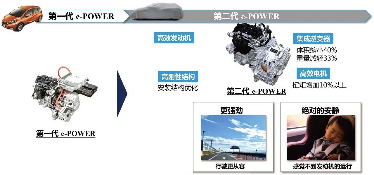 而此次引入中国的e-POWER技术已经发展至第二代,相比第一代,除了发动机效率和电机扭矩进一步提升外,因为集成逆变器,体积缩小40%、重量减轻33%,整体安装结构更加优化。