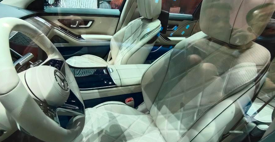 内饰方面,它所带来的奢华感其实与S级别并无太多差别, 方向盘的半径更大,中间的LOGO也采用了一种凸起式的造型,仪表盘和中控屏采用了分体式的设计,特别是大尺寸的垂直中控屏设计。此外车的坐垫,以及下方的踏板全部镶嵌后迈巴赫的LOGO!高档感十足,这样的内饰设计也是把该车显得极为科幻富有未来感。