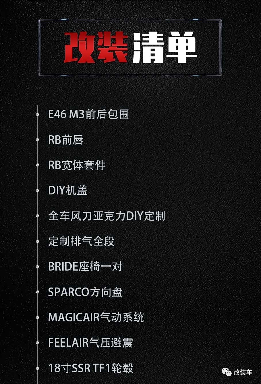 Kin的改车想法一直都很坚定,那就让E46呈现出最好的姿态效果,帅才是最终的目的。所以Rocky Bunny宽体,Magic air气动系统+Feel air气动避震,就给E46奠定一个宽体低趴的基调了。