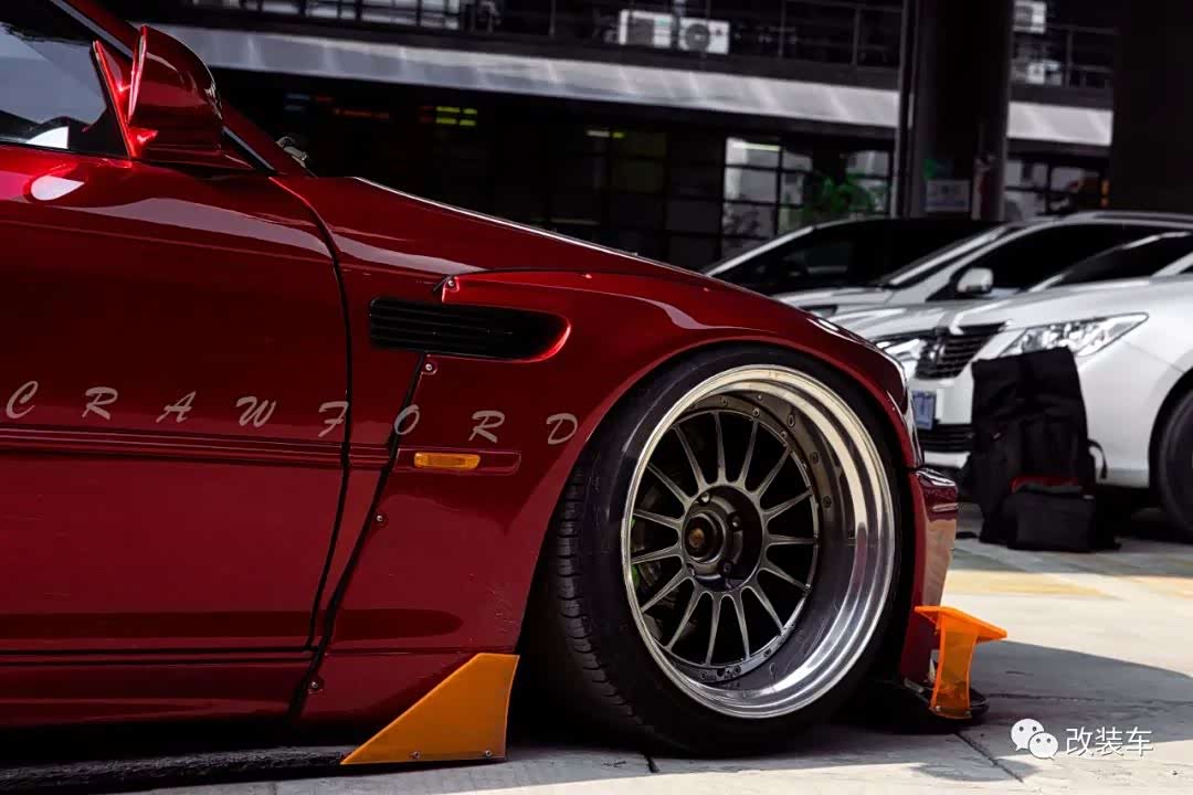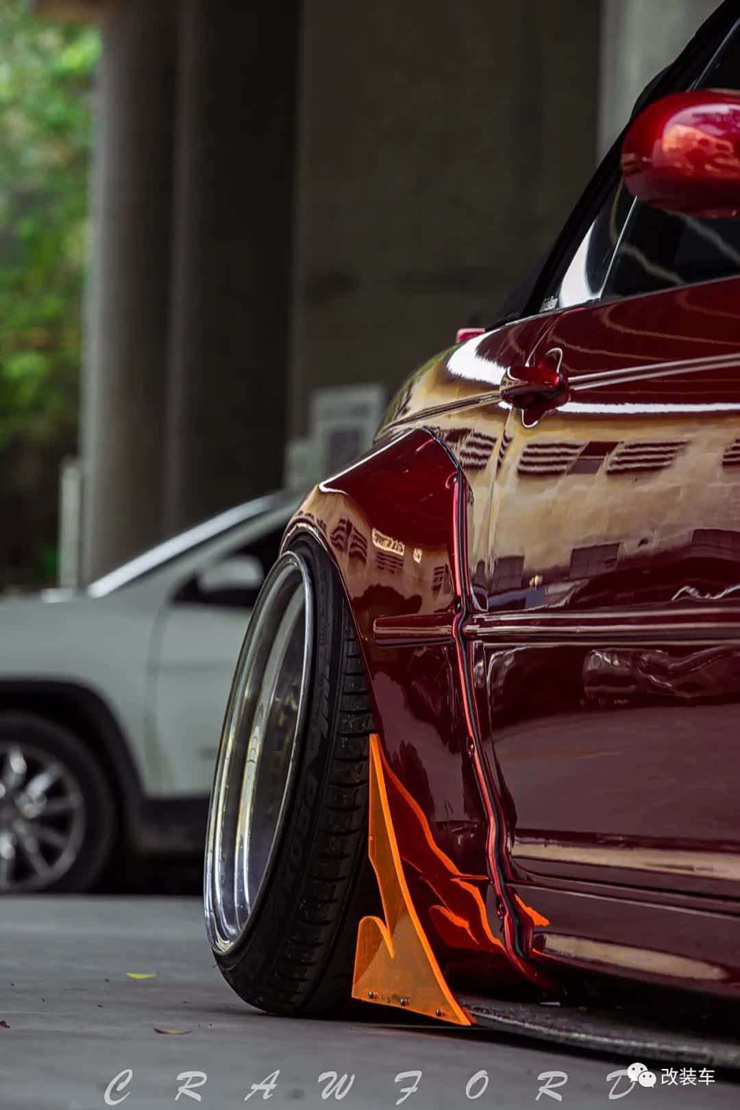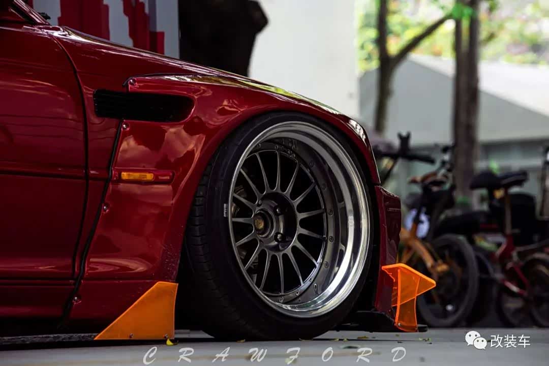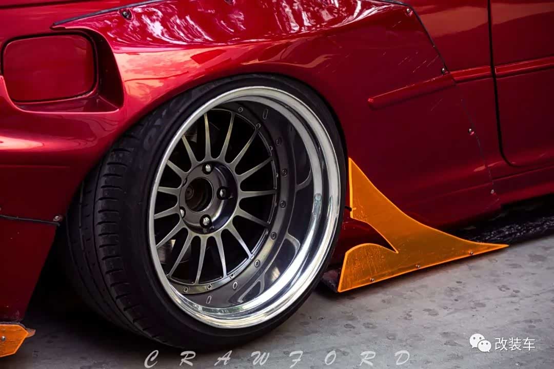 轮毂是一套18寸的SSR TF1,超大抛边就是为了配合宽体使用,把车身降到最低之后,Rocky Bunny宽体刚好落在拉伸的胎壁上,视觉效果一流。