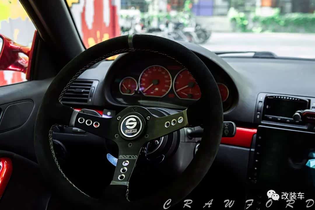 内饰的改动,可以说是非常运动了,Sparco方向盘就不用说了,空调出风口都换成了一块Lufi表。中控台的大屏幕显得有点格格不入,但总归是实用点。