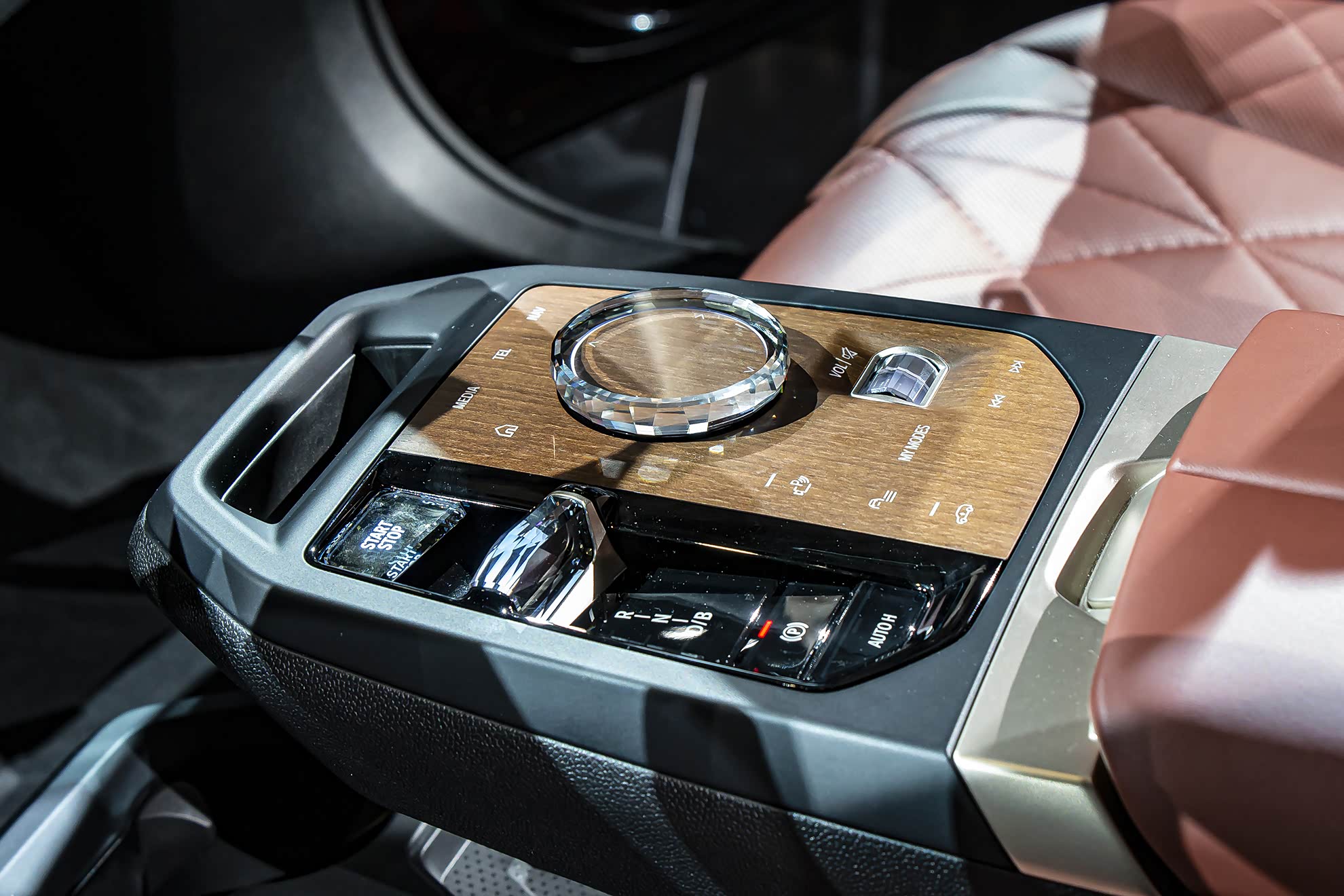 “轮子上的会客厅,从家到车的无缝延伸。”,这是设计师希望传达给用户的。于是iX用12.3英寸仪表+14.9英寸触控屏,组成了一体式悬浮曲面屏,向家里的大尺寸电视靠拢。前排扶手、坐垫向外延伸的座椅,分别是抽象化的咖啡桌与沙发。而座椅调节按键挪到了门板上,便于操作也用透明材质扮演了水晶饰品的角色。