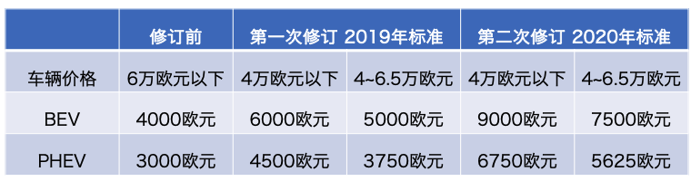 2019年德国第1次修订了补贴标准,到2020年第2次修订补贴标准,并且将补贴期限延长到2025年底。德国的新能源汽车补贴并不是按照续航里程来制定的,而是按照车辆的售价来制定的。其实这也很好理解,因为对于德国这样的欧洲国家来说,续航里程并不是评价纯电动汽车好坏的唯一标准,欧洲普遍流行的是两厢的小车,所以续航里程不会特别长。