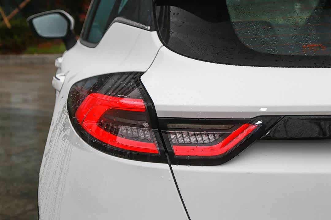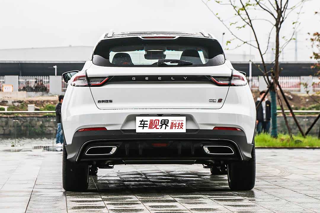 车尾部分,新车线条设计颇为紧密,采用了熏黑处理的尾灯组,灯腔内部的设计较为精致。值得一提的是,连接尾灯组的是一条较为宽大的黑色高亮饰板,并刻有“GEELY”品牌LOGO,使车尾看上去更有运动感,加强了辨识度。