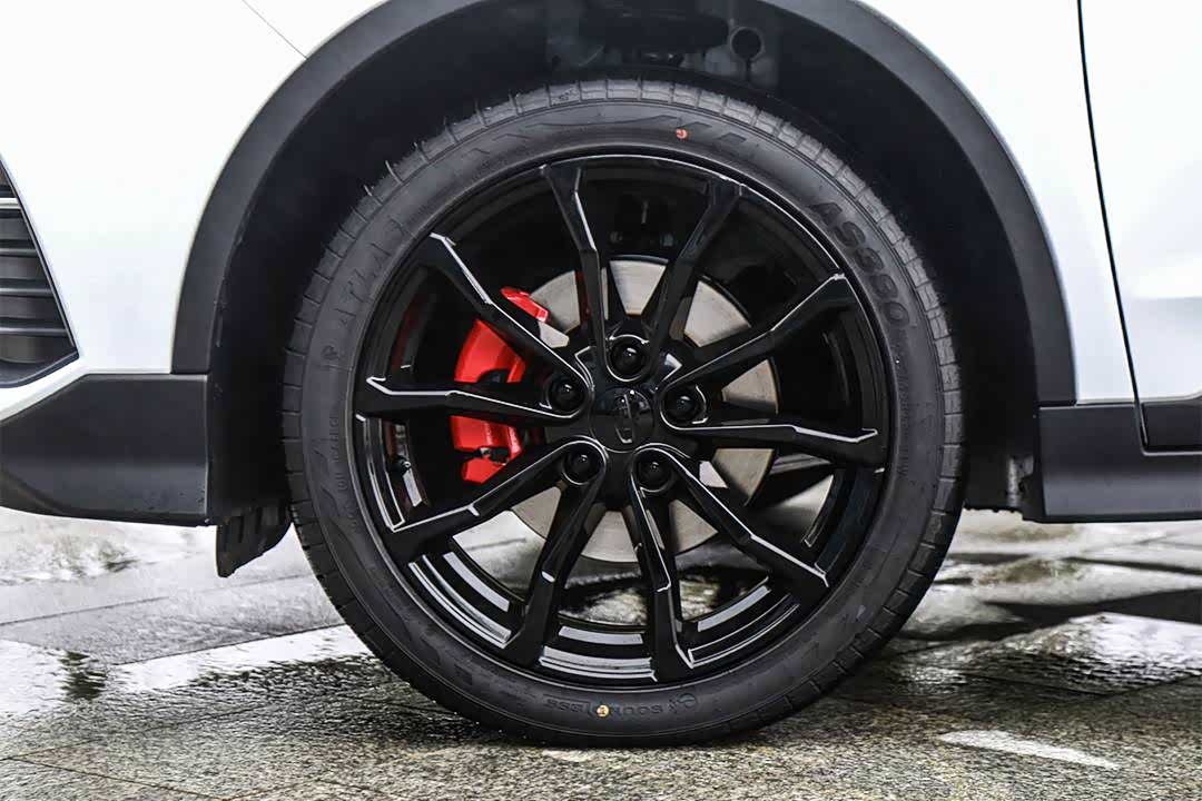 新车最入门级手动挡车型提供17英寸轮圈,轮胎规格为215/50 R17,其余三款CVT变速箱车型均匹配18英寸轮圈,轮胎规格为225/45 R18。值得一提的是,帝豪S为用户提供的是一套全黑多辐式轮圈,且自动挡车型均提供的是红色刹车卡钳,进一步加强了帝豪S的运动氛围。