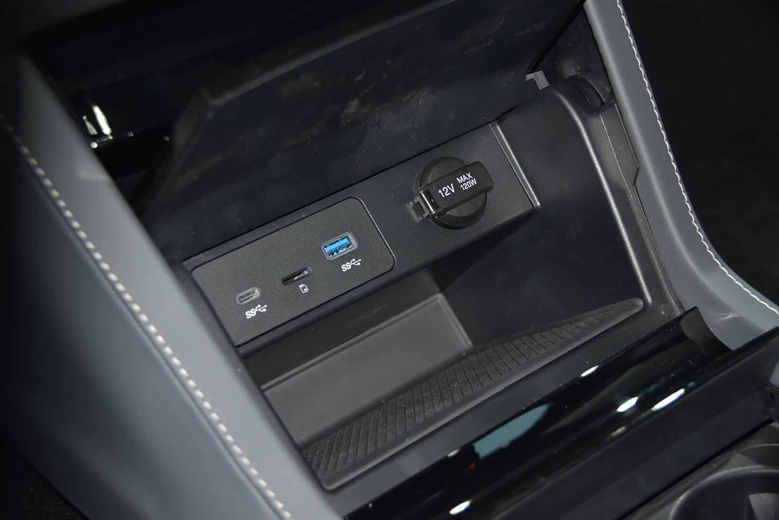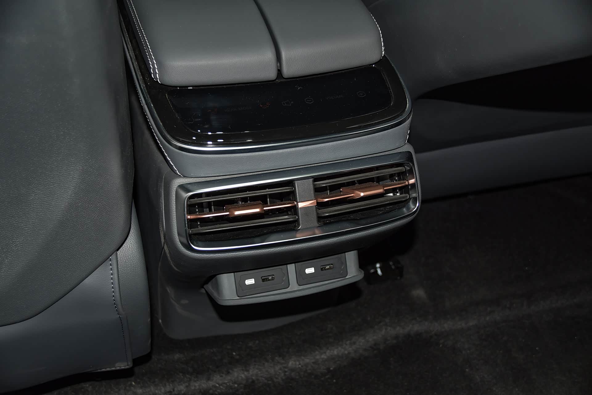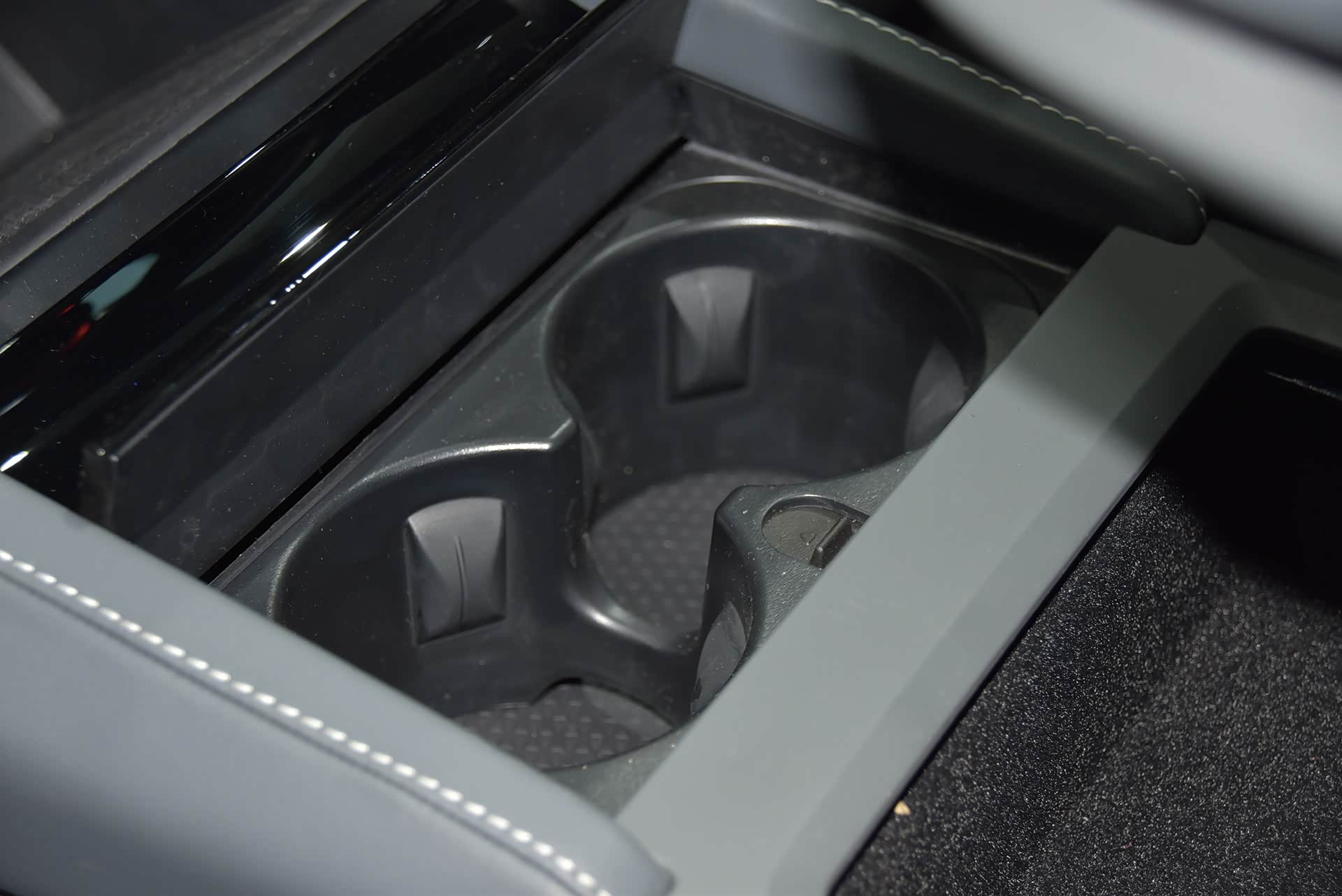中央扶手区域配有旋钮式按键,可以通过它对中控屏内的应用进行操作,金属材质按键采用了类似钻石切割的工艺,配合着旁边被香槟金色装饰条围绕的无线充电板,增加了内饰的精致感。而中控台的下方设有多个储物区和杯架,并且还配有12V电源和各类接口。