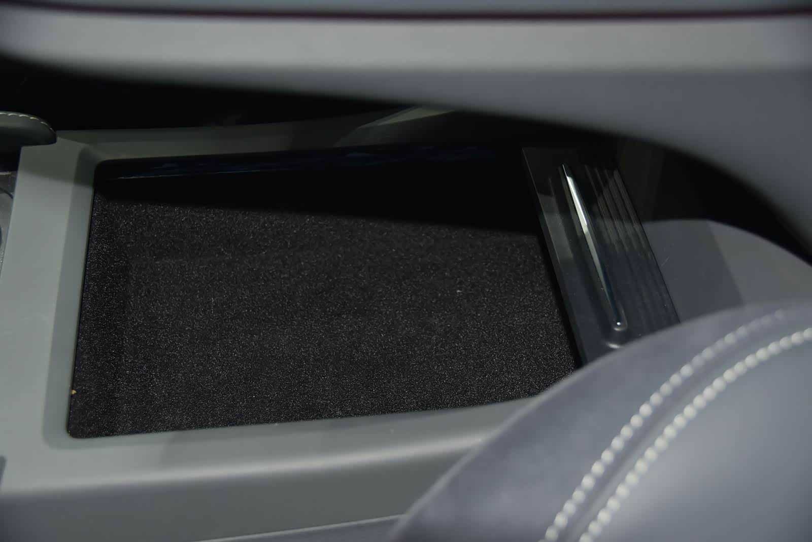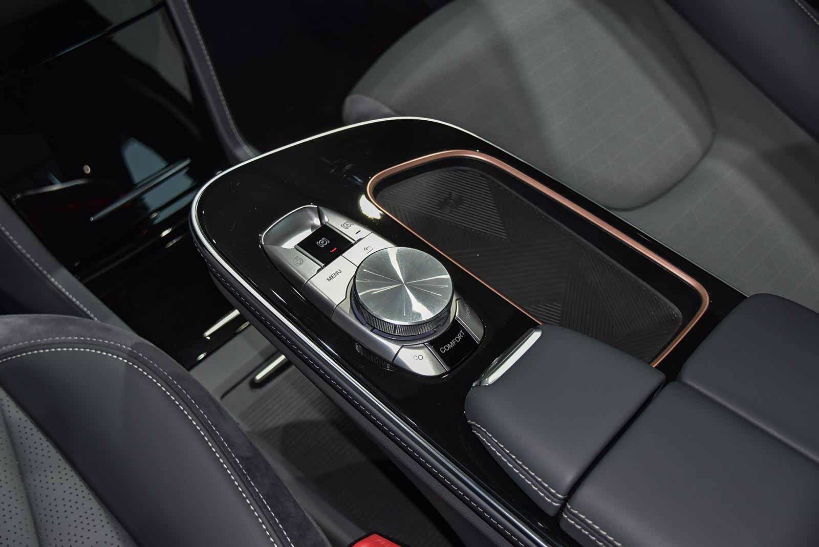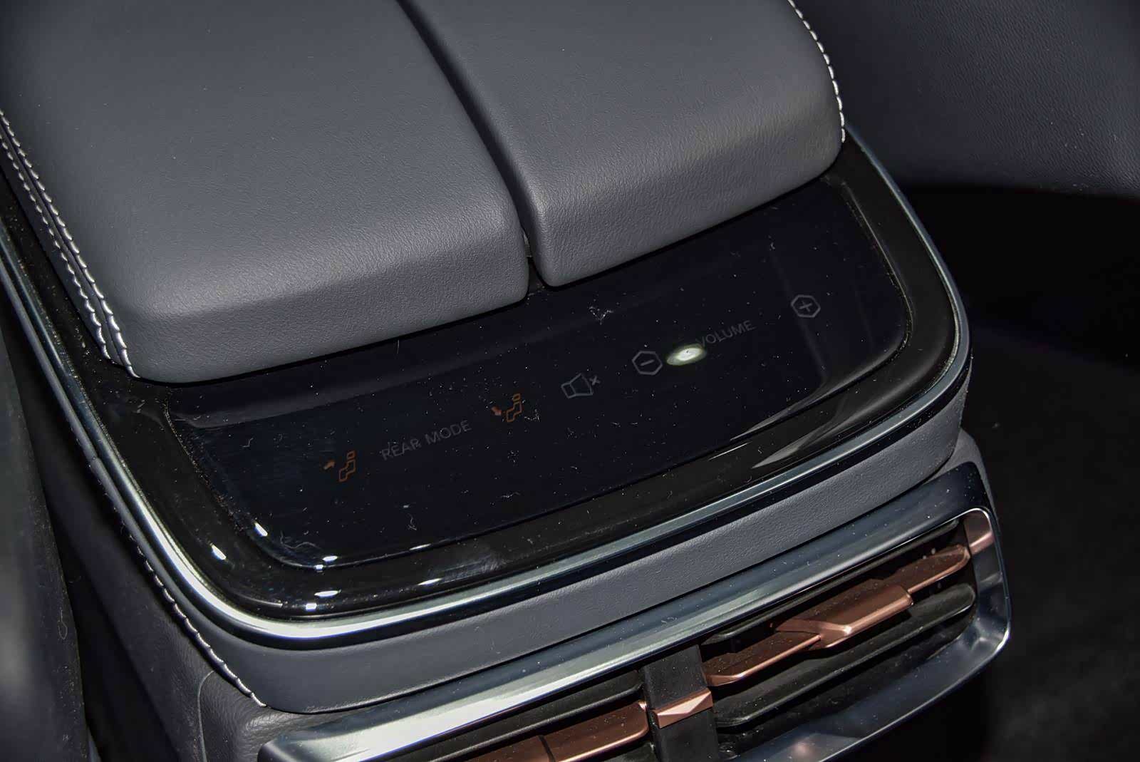 中央扶手区域配有旋钮式按键,可以通过它对中控屏内的应用进行操作,金属材质按键采用了类似钻石切割的工艺,配合着旁边被香槟金色装饰条围绕的无线充电板,增加了内饰的精致感。而中控台的下方设有多个储物区和杯架,并且还配有12V电源和各类接口。