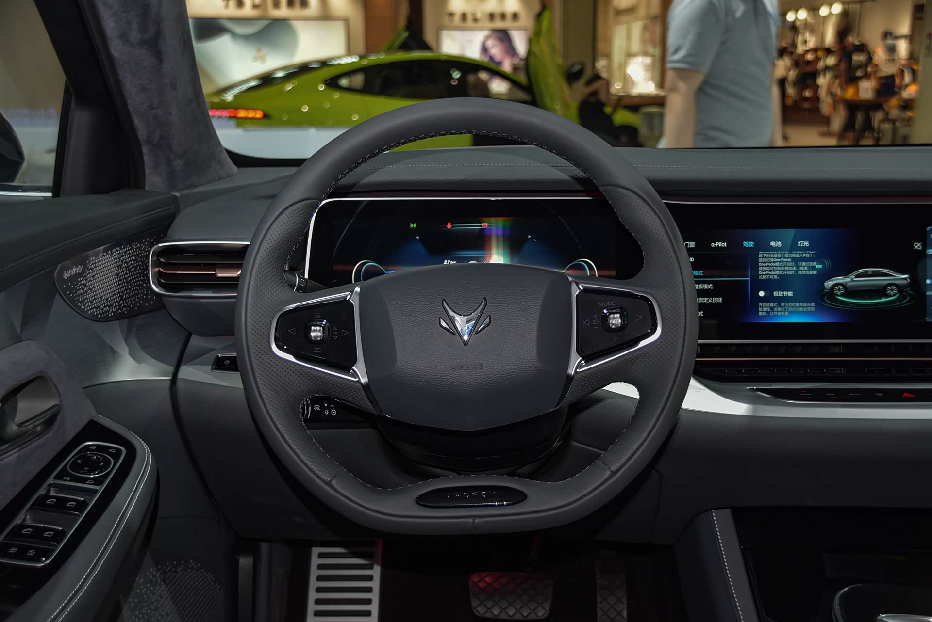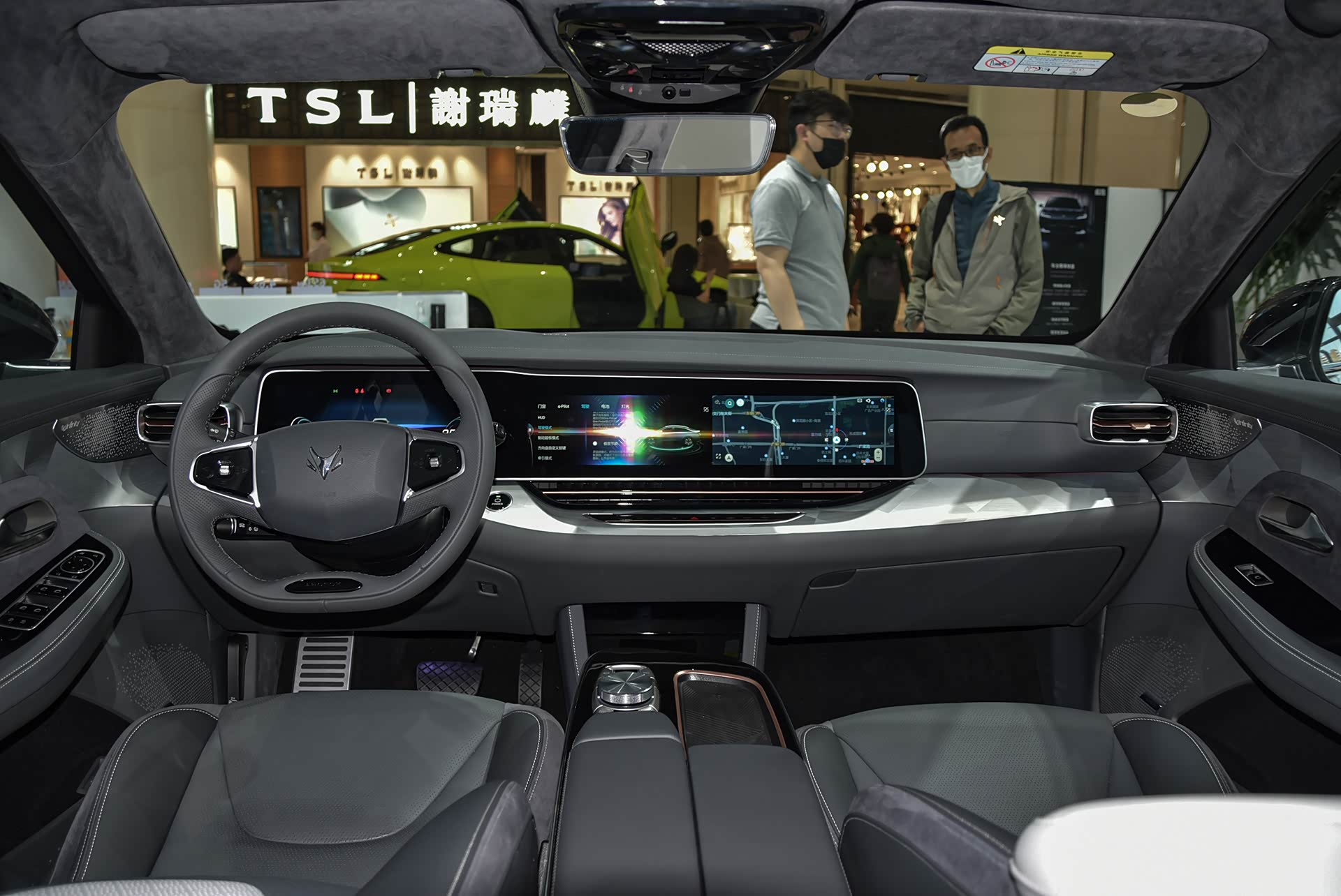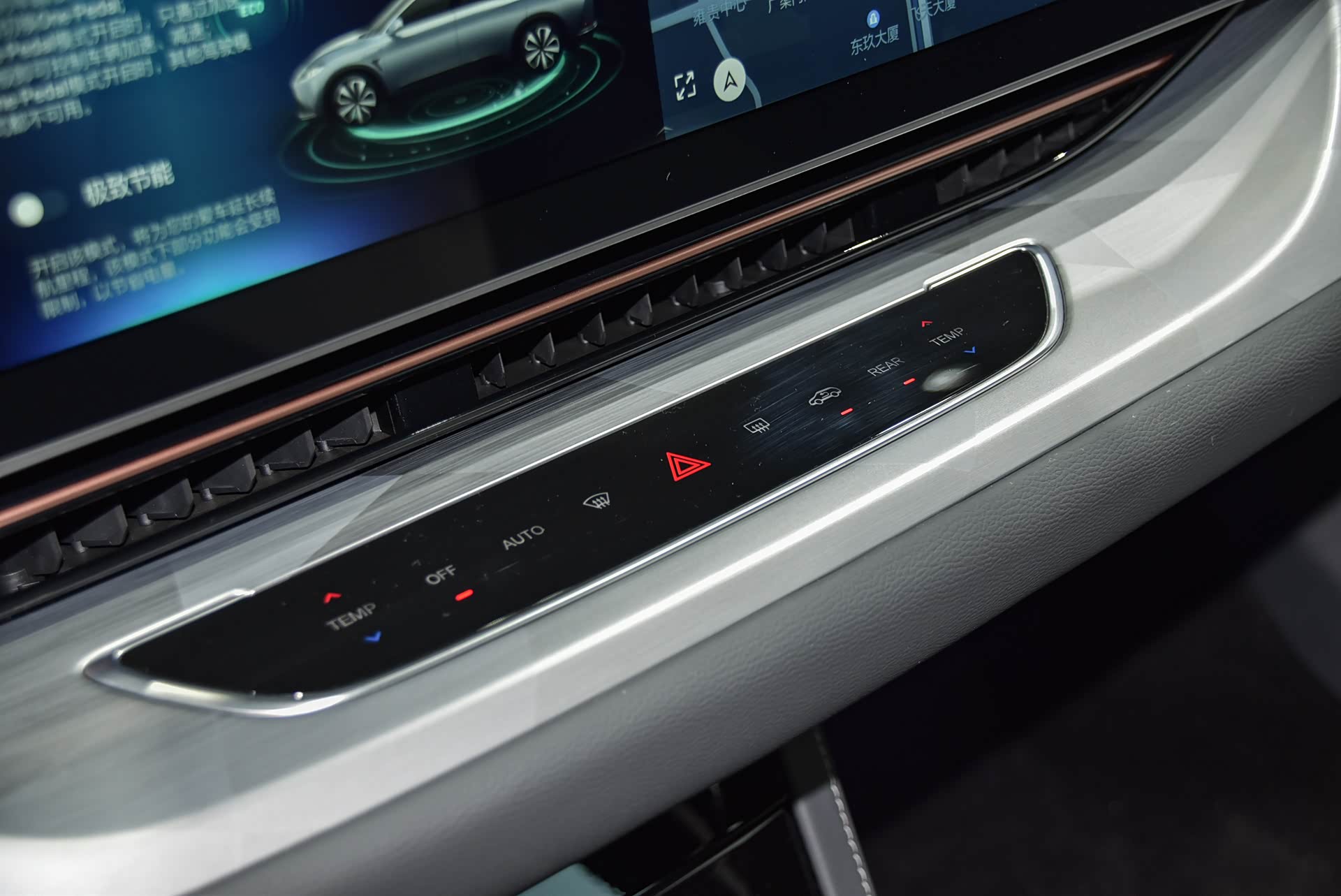 进入车内,ARCFOX极狐阿尔法S的内饰整体以黑色为主,中控台的下沿配有银色饰板装饰,并在空调出风口等处加入了香槟金色装饰条,带来了不少“小资”的感觉。仪表盘、中控屏幕采用了连屏设计,合体为一块20.3英寸的大屏,甚至延伸到了副驾座椅的前方。不仅如此,它还支持多屏互联、智能语音交互,也可以OTA远程升级,是不是科技感满满。