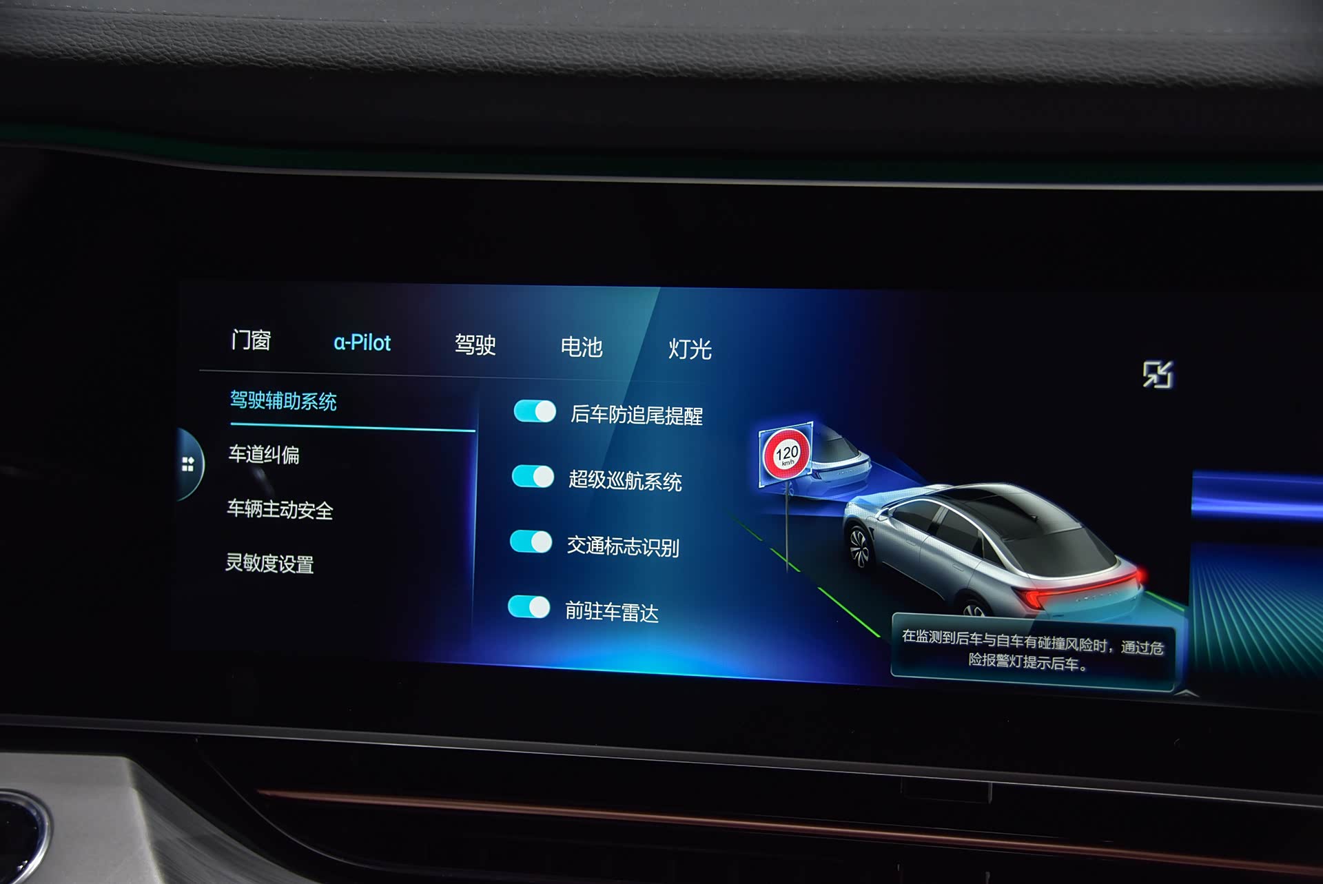 其次,两辐式的多功能方向盘后方是一块12.3英寸全液晶仪表,UI设计和画面的细腻程度都非常不错,配合着HUD抬头显示系统,组成了“四屏互联”的效果。同时,ARCFOX极狐阿尔法S拥有12个超声波雷达、5个毫米波雷达、4个全景摄像头、1个前向摄像头和1个驾驶员人脸识别摄像头,所以它支持HWA高速公路自动变道辅助、CBC智能弯道续航、RCTA后向行人/车辆穿行预警等高级辅助驾车功能,为行车安全保驾护航。