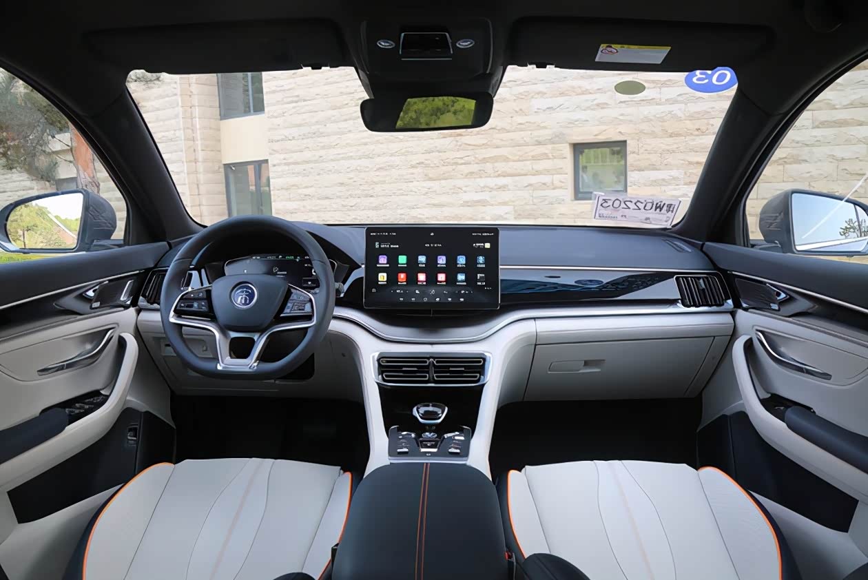 宋PLUS EV的内饰色彩搭配比较时尚,整体为日蚀蓝+苍穹灰的撞色搭配,部分地方还用上了橘色缝线和装饰线,看上去非常的年轻。而在细节的刻画上,这款车也十分用心,不仅材质和用料看上去都很有档次感,缝隙也十分均匀。