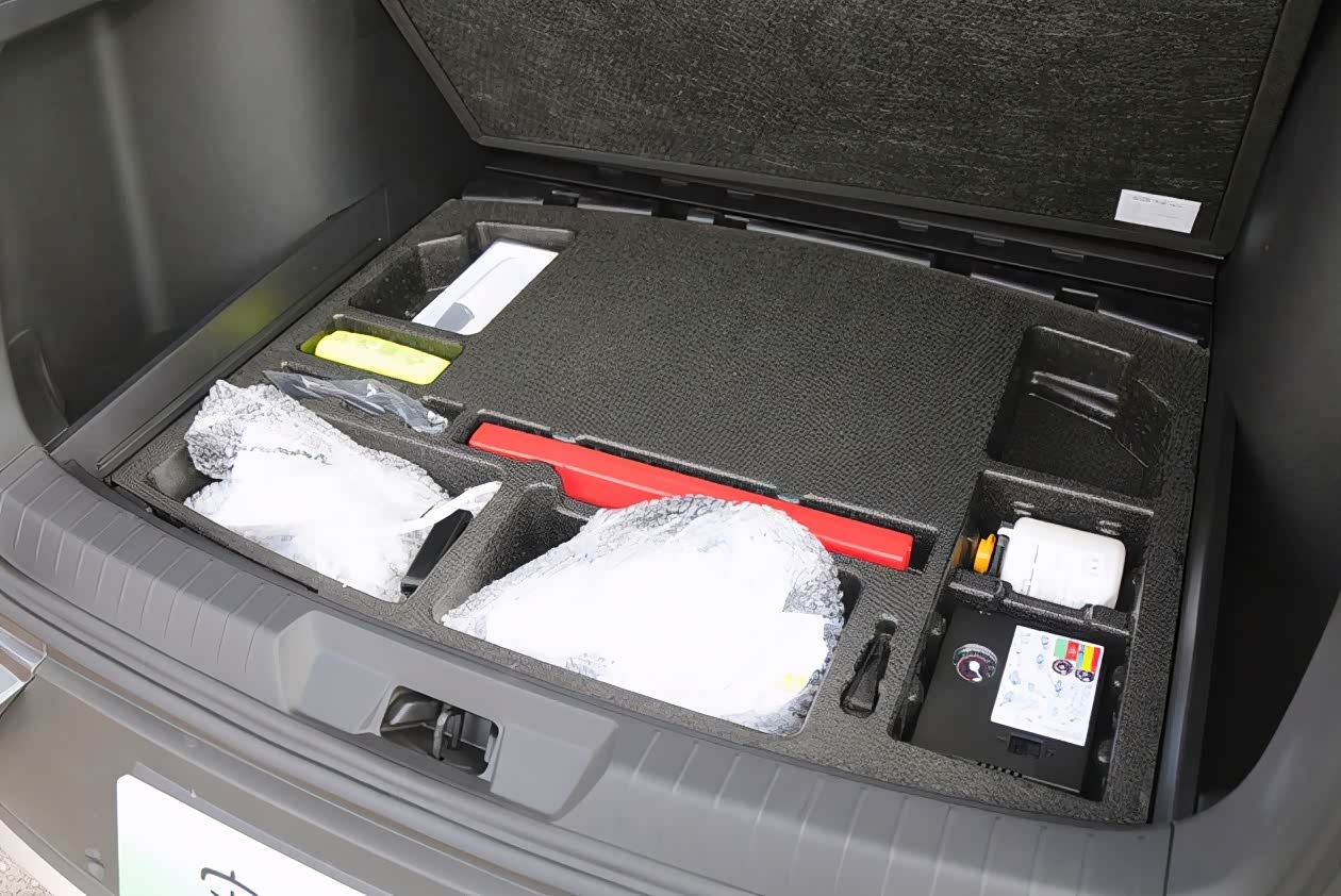 后备箱地板下是个多分区的储物槽,除了常规的220V充电线缆、应急补胎液、充气泵等“老面孔”之外,宋PLUS EV还全系标配了VTOL功能,它可以通过专用的转接器来实现对外放电的能力,就像个超大号的移动电站,进一步拓展用车的方式。