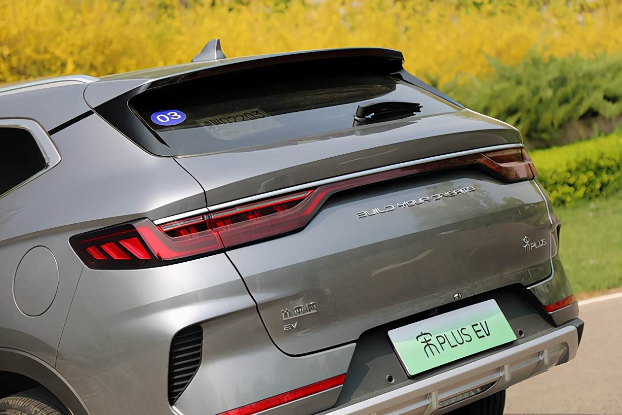 车尾的整体造型非常饱满圆润,尤其是细长的尾窗和高挑的尾部曲线让宋PLUS EV看上去就那么宽厚。看到从头到尾延展而来的侧面腰线了吗?这个锋利的超大折角的曲线非常考验车企的冲压工艺,甚至没有几个合资品牌能做到,现在比亚迪已经完全掌握,进步神速。