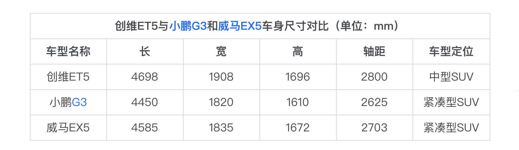 首先,创维汽车的首款车型创维ET5采用了“以大打小”的策略,相比于同价位的对手小鹏G3和威马EX5,创维ET5的中型SUV尺寸占有一定的优势,尤其是2800mm的轴距,令其拥有更大的车内空间。
