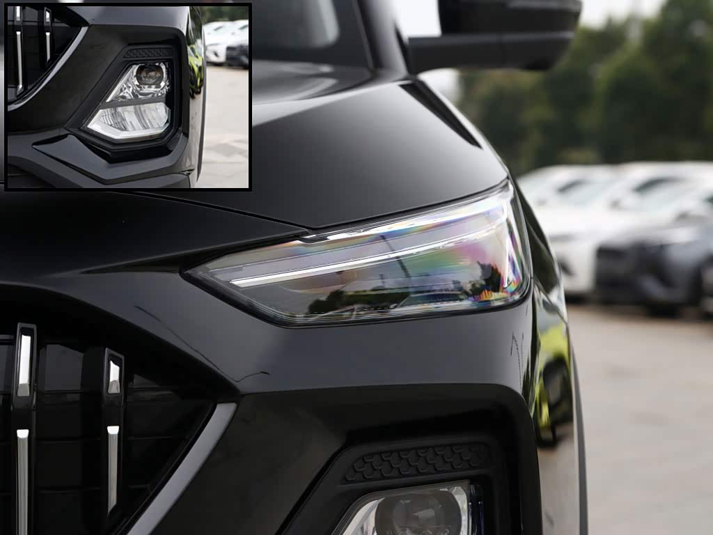 头灯采用了同级少见的分体式结构,上方扁平的灯组为LED日行灯,拥有如“鹰眼”般锐利的灯光效果;分体式近远光灯布置在侧腮,搭配立体的导风口造型显得格外动感。