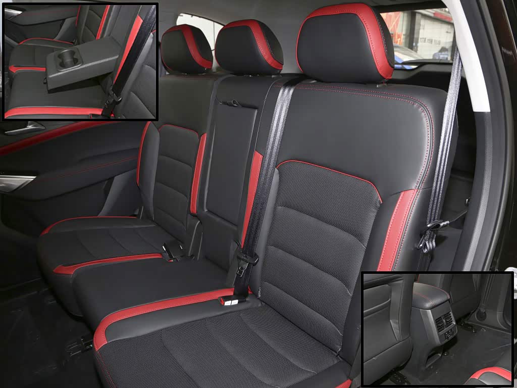 这台五座车,后排座椅材质与前排相同,同样加入了丰富红色元素装饰,提升视觉动感。坐垫的长度很充分,腿部支撑性足够。全系二排座椅都支持前后调节和靠背角度调节,因此空间与坐姿都有更好的适应性。空间方面,侃弟身高175cm,头顶接近两拳,腿部两拳多,非常充裕。这台车配备有三个独立头枕、地台式空调出风口、两个USB接口和储物格,地板也基本全平。6座车型中间是两个独立座椅,除了乘坐更显高档和舒适,中间过道进出也更方便。