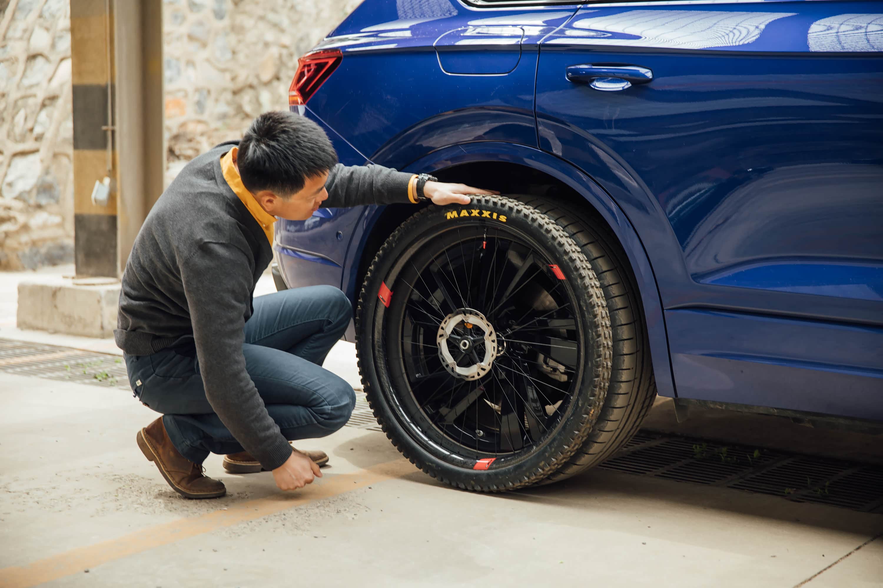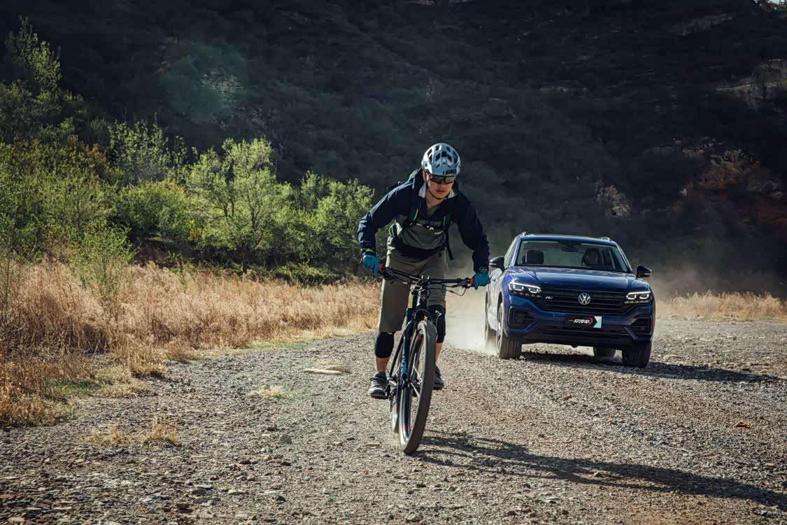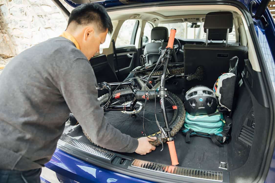 不过在真正的较量之前,我需要先接上尤添麟和他的爱车,因为从市里到河滩的路程着实不近。与我们传统印象中的26寸自行车不同,尤添麟的ENDURO山地车达到了29寸,比普通山地车大了不少,车轮甚至与途锐20英寸轮毂大小相同,再加上各种骑行装备,一般的轿车或是SUV还真装不下。而此时途锐最多可达1800L的后行李厢就派上了用场,只需通过快拆将自行车前轮拆掉就可以轻松将整辆自行车装进途锐车内。并且途锐独有的“装载模式”也让后行李厢的高度更低,让装卸物品更加轻松。