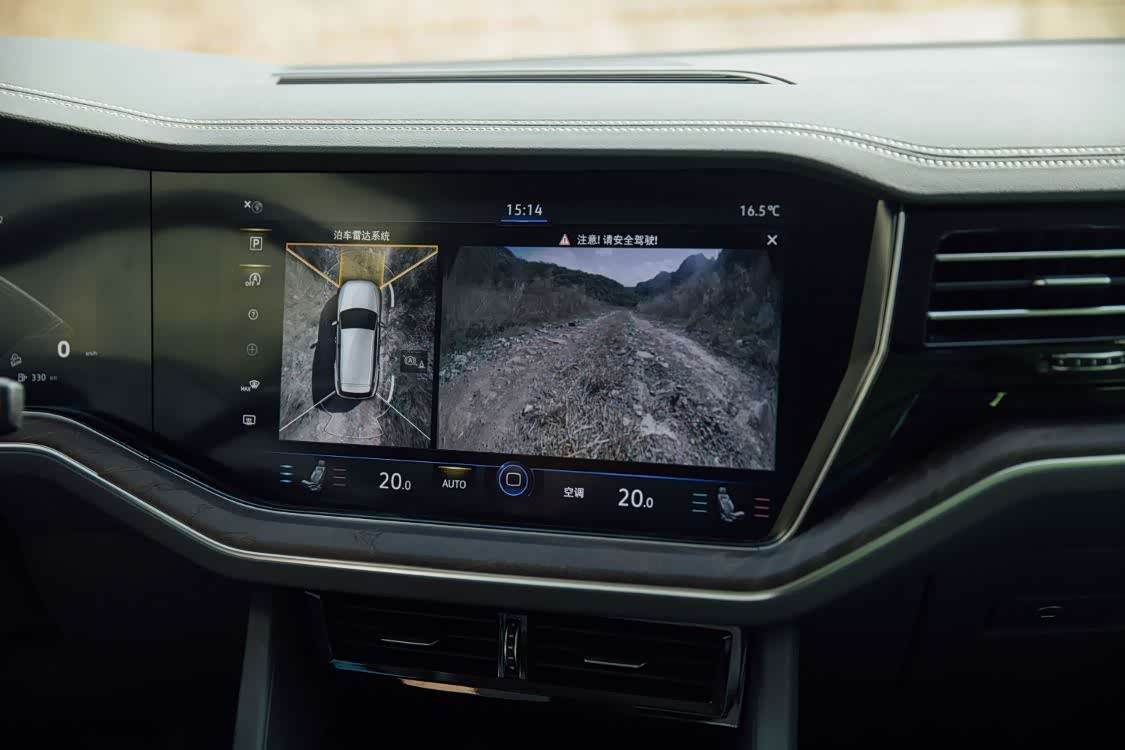 此外,由于河滩上的碎石非常多,大多锋利无比,对轮胎有着不小的威胁。所以我打开了途锐的360°3D全景影像。在绝大多数人的印象中,360°3D全景影像更多是对停车有所帮助,但在实际越野过程中也非常受用,它可以帮助驾驶者全面了解当前路况,消除视觉盲区,从而帮助驾驶者更安全的越野。