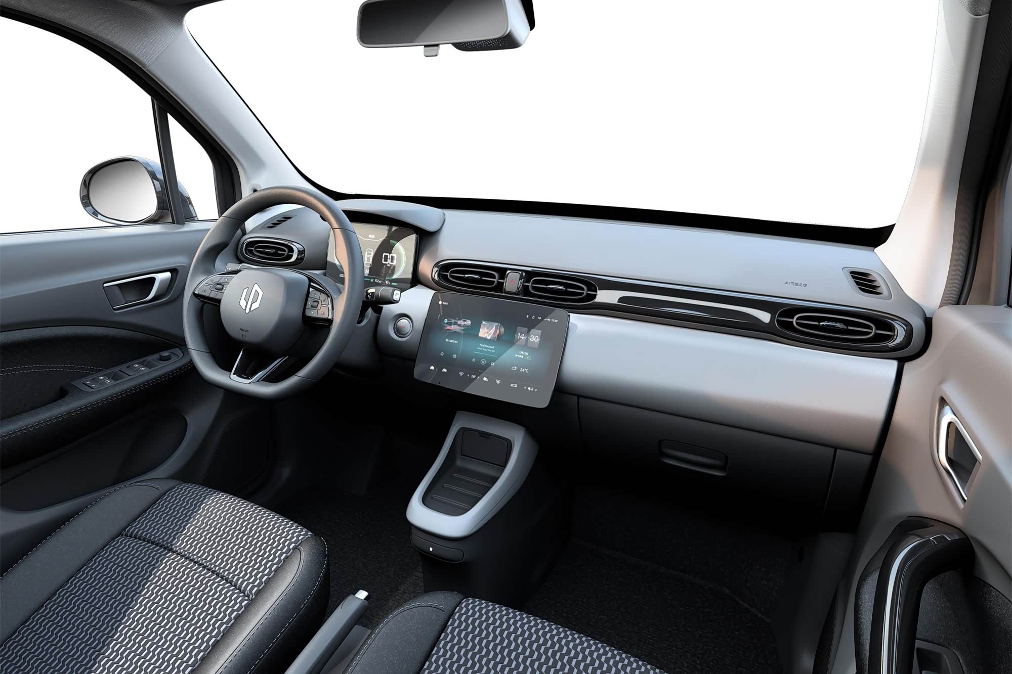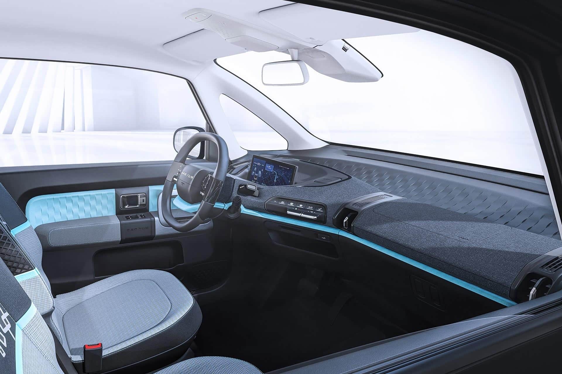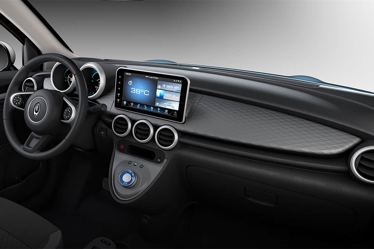 内饰部分设计非常简洁,采用了“几何”设计语言,贯通式中控台令驾驶者的腿部和空间更加出色。内饰采用了植物纤维制成的环保材质,非常符合新能源汽车的定位。方向盘采用了双幅式造型,并集成了多功能按键,设计感极强。悬浮式的全液晶仪表尺寸为10.25英寸,因为没有中控屏幕,所以整车的多媒体控制以及导航等均集成在这块屏幕之内,简洁且具有科技感。新车同样为四座版本,作为应急来说,整体表现还是不错的,日常情况下,两个人使用是非常不错的选择。