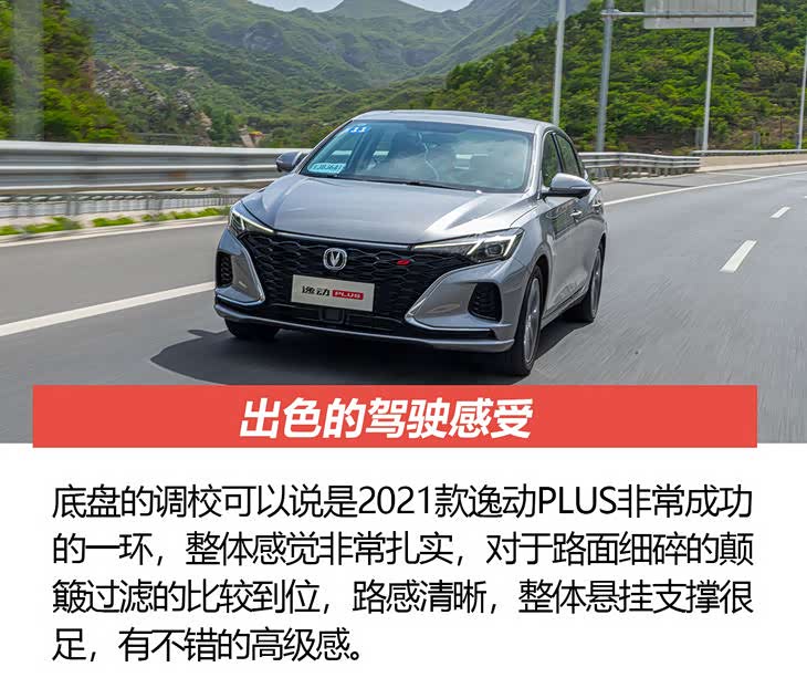 2021款逸动PLUS的底盘质感可以说非常不错,并不像很多几万元的车那般松散,开着很没有高级感。而2021款逸动PLUS的底盘质感非常扎实,虽然不及豪华车那般,但足矣吊打10万元的很多车型。悬挂对于路面的过滤非常干脆,传递到驾驶员身上只有清晰的路感,并且后排的舒适度也足矣让乘客津津乐道。