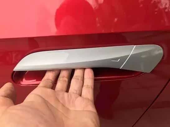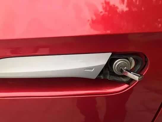 稍微用力向外拉车门把手,取下把手后面的锁芯罩盖,将机械钥匙从遥控钥匙内取出,插入门把手的钥匙孔内,逆时针转动钥匙,再用力向外拉车门把手,即可打开车门。