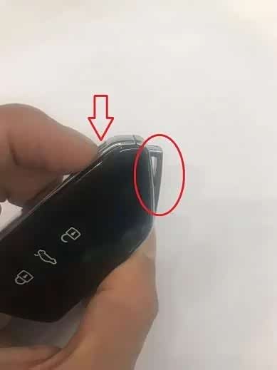 按下钥匙末端的按钮,如下图的箭头所示,取出机械钥匙,如下图红圈所示。