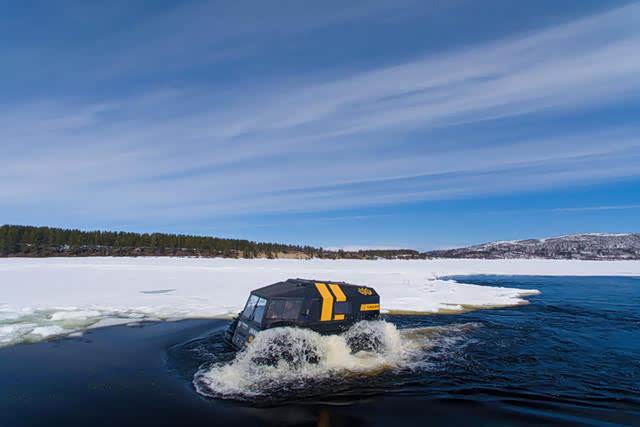 但是你认为它仅仅如此就大错特错了。他还能入海!它配备的可自动充气的巨大轮胎可以容纳800升空气,产生7000磅排水量。它四个巨大的空气轮胎如同船桨一般,可以推动它以每小时6公里的速度前进。不仅可以上山,入海也不在话下。