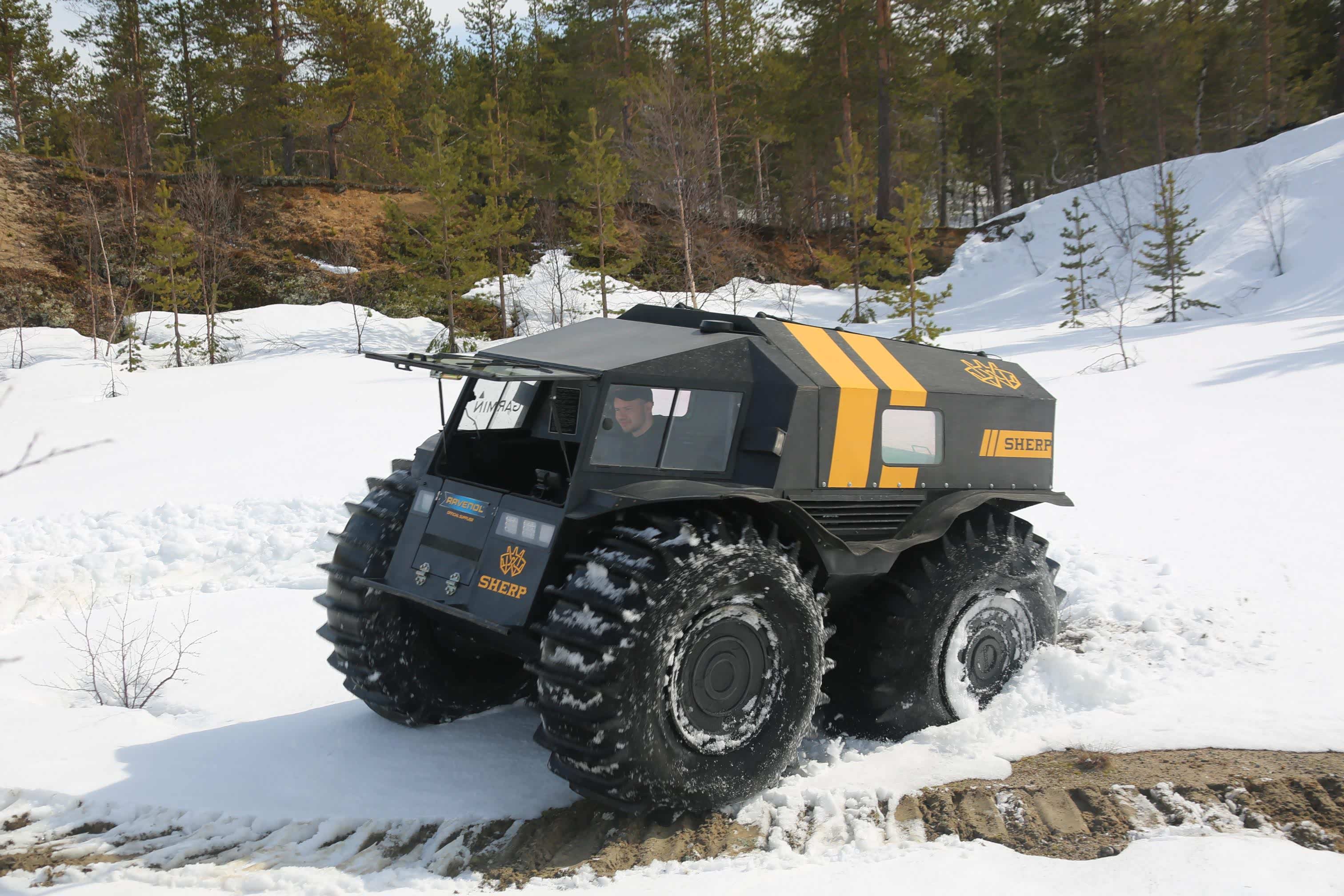 它的轴距非常短,而轮胎又非常大,为它带来了550mm的离地间隙。Sherp ATV可以轻松从高达699mm的障碍物上跨过去。而他专利的低压气动循环悬架使得轮胎可以紧密的贴合在障碍物上。以获得巨大的抓地力。在国外举行的沼泽地越野比赛中,别的车辆无法通过的沼泽地带,对它来说如履平地。因此在陆地上他可谓是无所不能,上山、入沼泽都不在话下。
