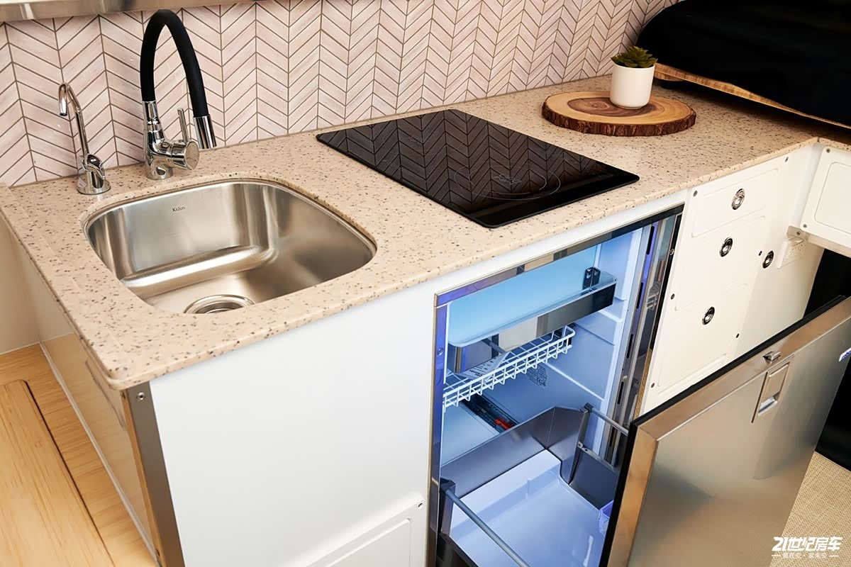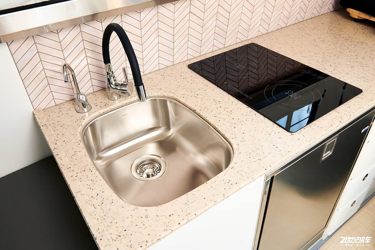 厨房采用高级一体式台面,配有不锈钢水槽,电磁炉和12V 120升冰箱。