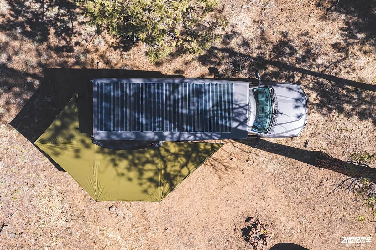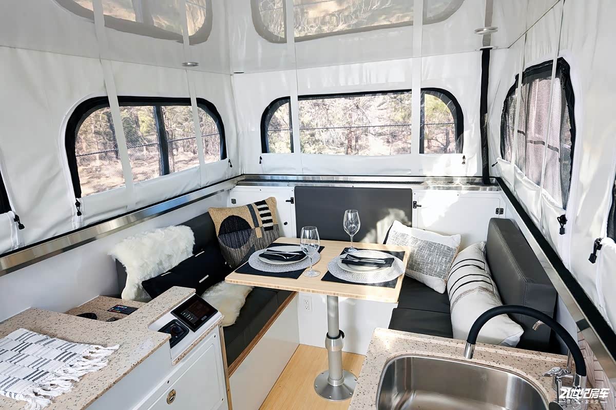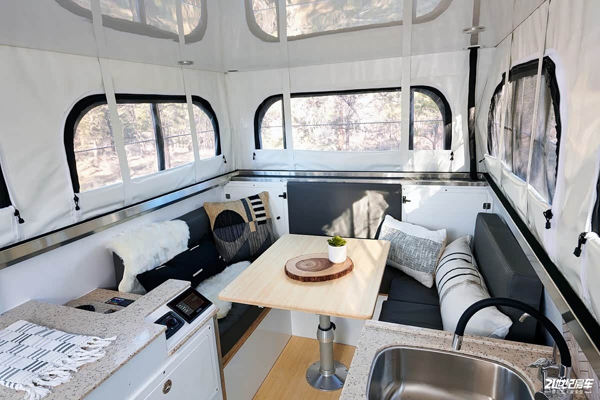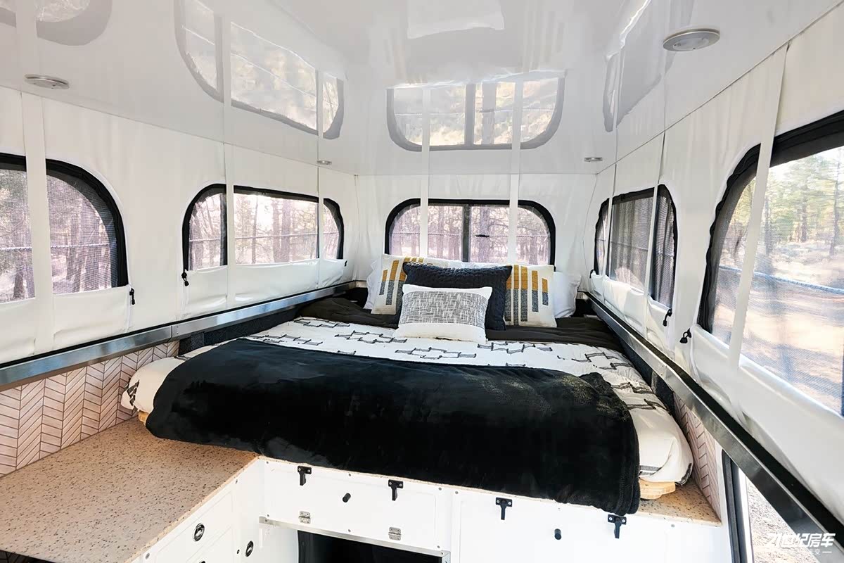 软质三层篷布包括8个可提供360度全景的窗户,并包括防蚊虫帘,隐私帘和透明的乙烯基保护层,无需使用锁止机构即可升高或降低屋顶。厢体的泡沫芯复合材料结构和多层篷布提供了非常好的防护性能,一年四季节不同气候都可起到保温/防止热量散失的功能。