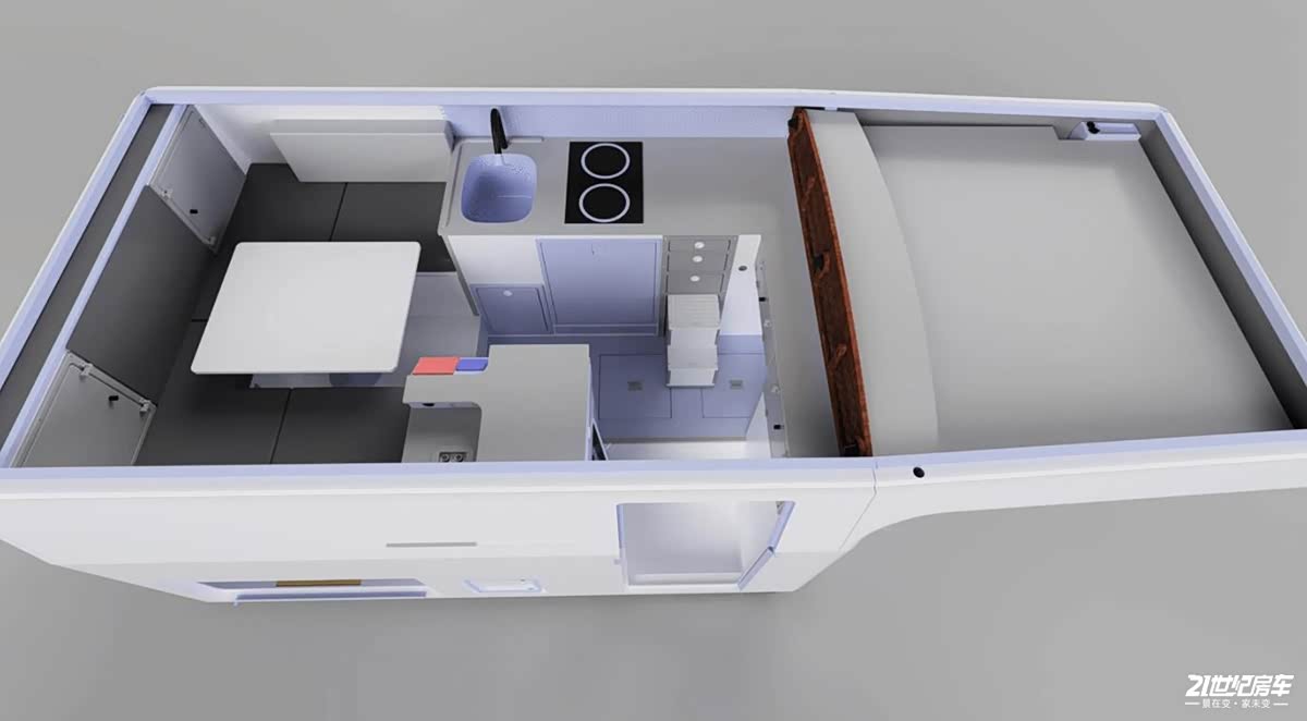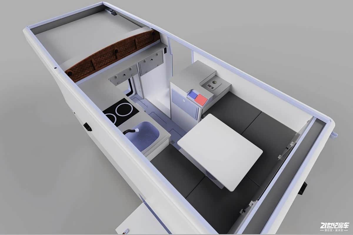 通过设计图可以看到整个车内布局,驾驶室上方是一张双人大床,后舱区是一组大U型沙发座椅带餐桌,中间部分是储物柜和全尺寸厨房。