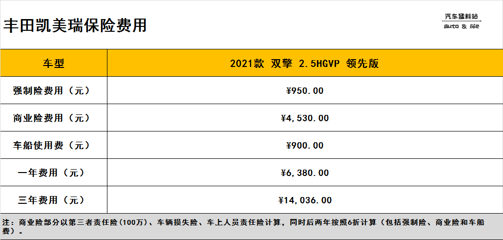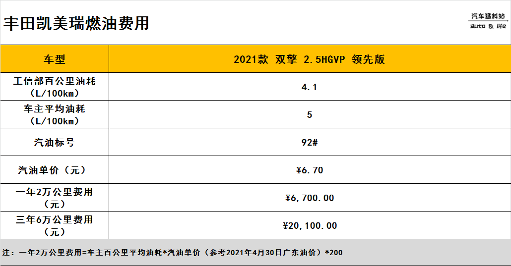 从上表可以看出,这台低配凯美瑞双擎混动版的落地价为24.6万元,这样的价格刚好能满足朋友25万以内的购车预算,而后续的养车费用,我们也以这一版本来进行分析。