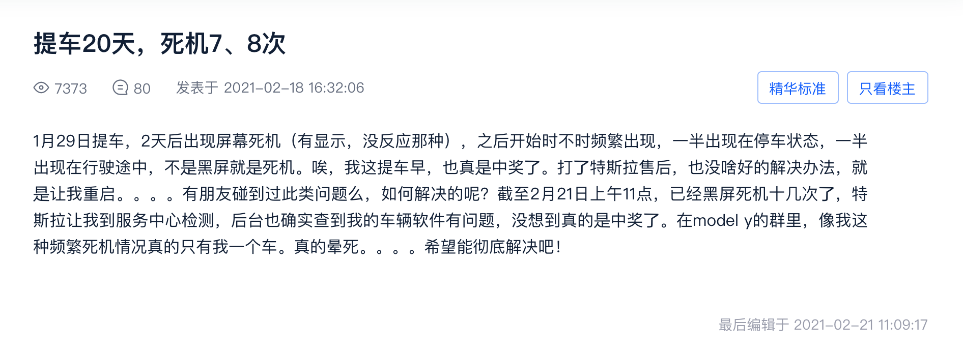 特斯拉的中控屏采用的是消费级的操作系统和硬件,在车规级的环境使用肯定会存在黑屏、死机的现象。特斯拉官方声明,尽管中控屏会死机,但是不影响驾驶,因为有2套系统,中控屏只是前端显示和配置设置,后台有ECU系统等正常工作。行车途中如果中控屏死机还是挺危险的,毕竟各种灯光、导航都失灵了,必须谨慎驾驶,停靠安全地带进行处理。