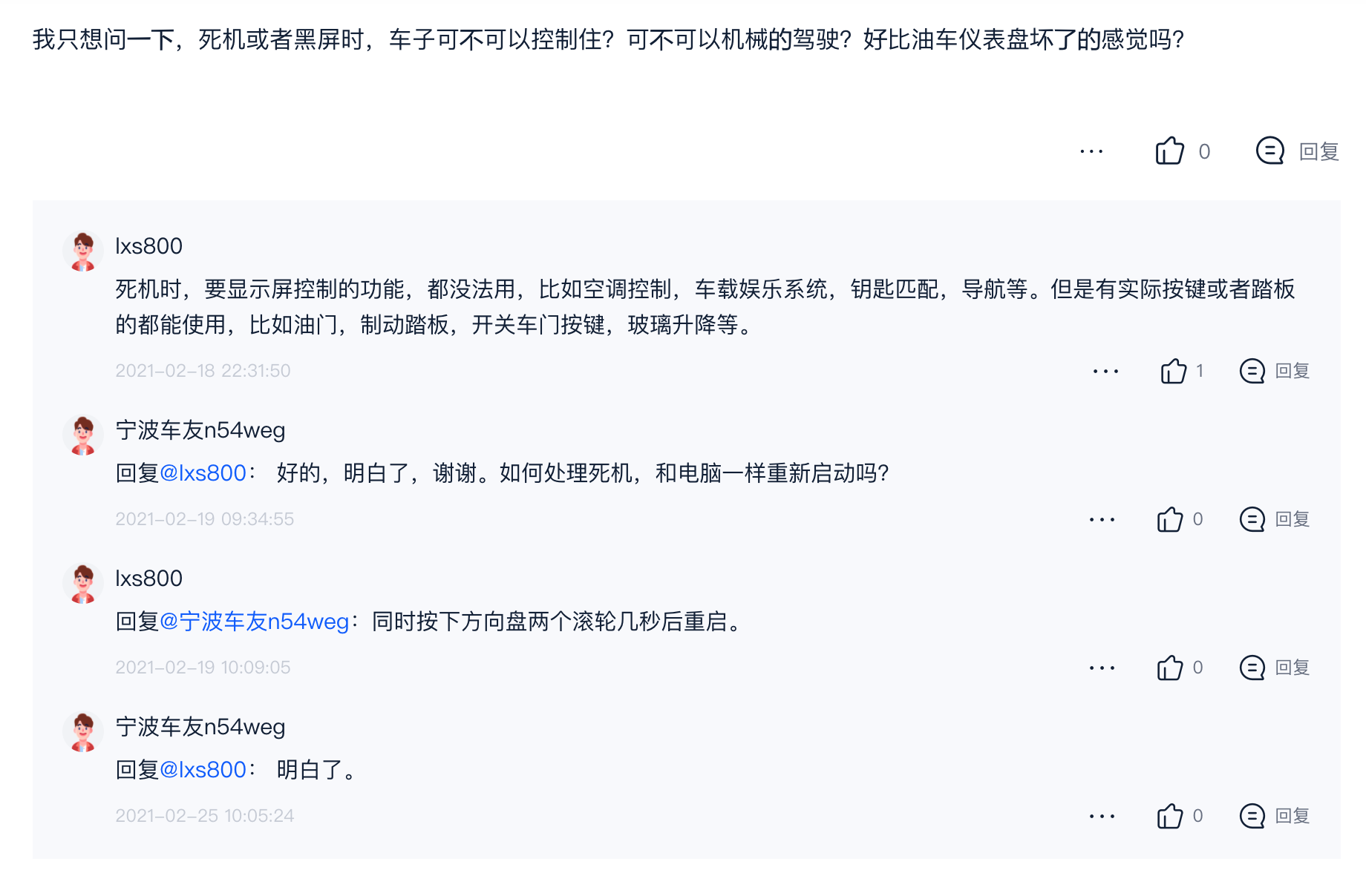 也有在高速公路上出现“死机”的,屏幕有显示,但是没有任何反应。一般情况下,死机影响了转向灯、双闪、车内灯等,还有一些控制功能失效,比如空调控制、车载娱乐系统、钥匙匹配、导航等都会失灵。尽管有死机现象,但是有实际按键或者踏板的都能使用,比如油门,制动踏板,开关车门按键,玻璃升降等。