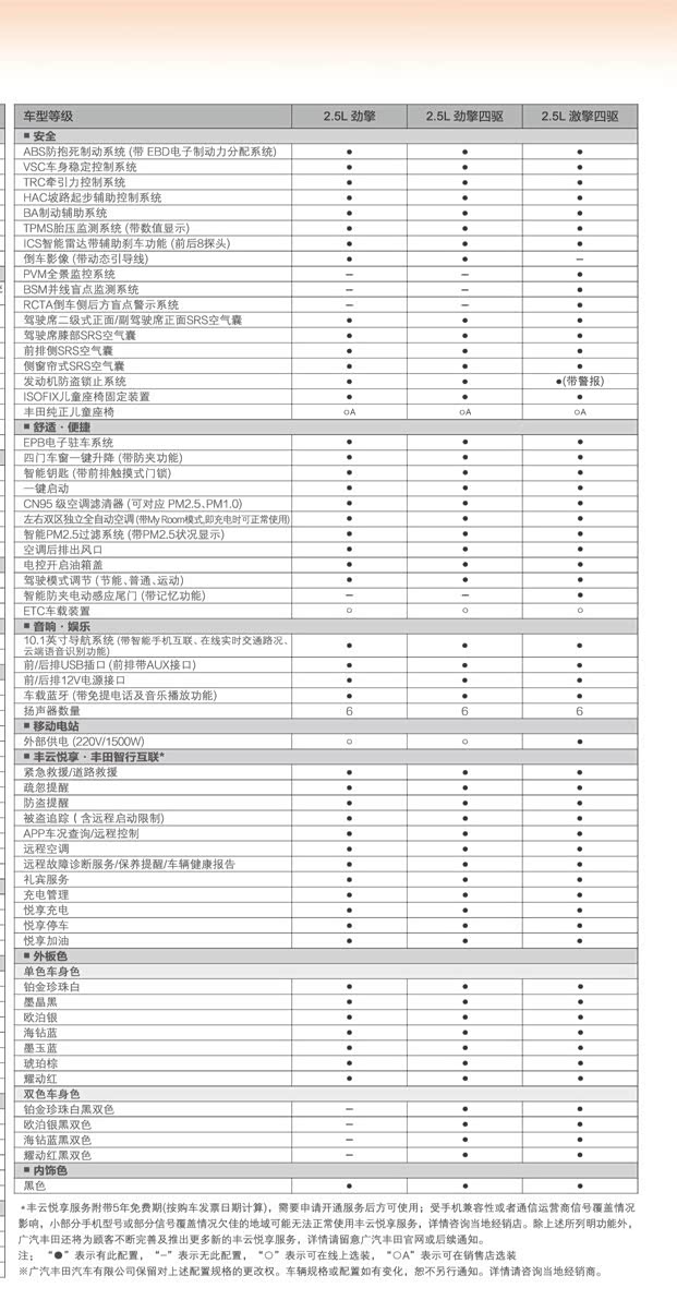 配置方面,新车全系标配电动天窗、LED前大灯/日行灯、光感智能前大灯系统、LED尾灯、真皮多功能方向盘、方向盘加热、10英寸彩色HUD抬显、驾驶席10向电动调节、前后排座椅加热、双区自动空调、10.1英寸中控屏等,配置十分丰富。安全配置方面,新车全系标配Toyota Safety Sense智行安全套装,包括带行人识别的预碰撞安全系统、全速域自适应巡航、车道循迹辅助、自动远近光等功能,此外还配备了胎压监测、辅助刹车以及全车9气囊等基础安全配置。