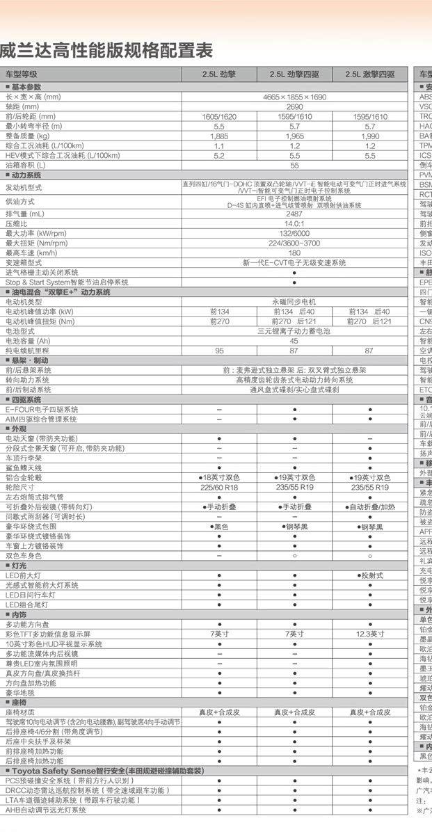 动力方面,相较于威兰达HEV,威兰达高性能版搭载了容量更大的电池组,并且燃油经济性进一步得到提升,百公里综合油耗最低仅为1.1L。已经曝光配置的三款车型均搭载2.5L混动系统,其中2.5L自然吸气发动机最大功率132kW,峰值扭矩224N·m。