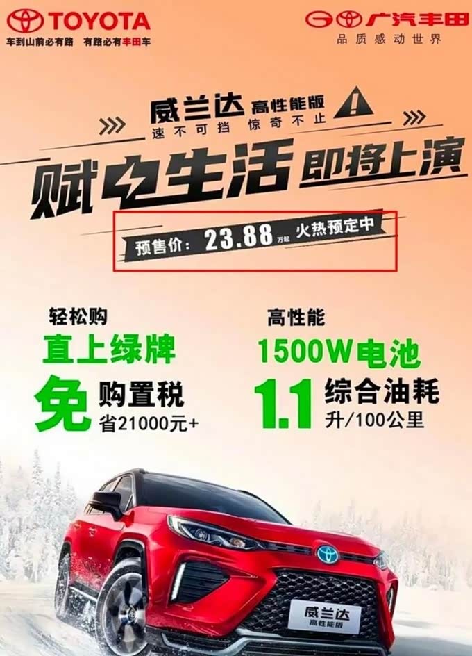 2021上海车展期间,广汽丰田正式发布旗下威兰达高性能版(插混版)。新车在外观方面基本与燃油版车型保持一致,仅在细节做出调整,整体风格更具运动气息。近日网新社从网络上获悉,威兰达高性能版的预售价为23.88万元起。据悉新车将在5月上旬开卖,具体日期或为5月8日。威兰达高性能版采用PHEV插混动力,其1.1L/100km的最低油耗按当前油价来计算,每公里油费仅在7分钱左右。