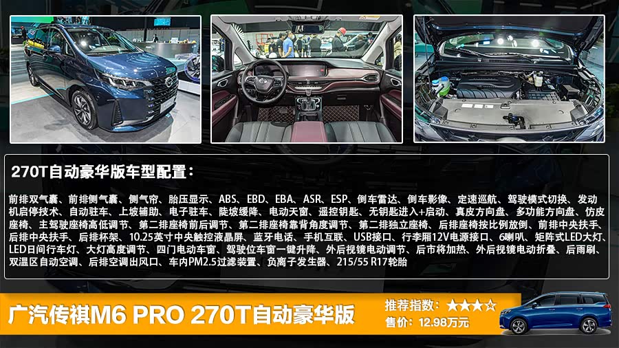 作为传祺M6 PRO价格最低的车型,售价为12.98万元的270T自动豪华版在配置方面配备了前排双气囊、前排侧气囊、侧气帘、胎压显示、ABS、EBD、EBA、ASR、ESP、倒车雷达、倒车影像、定速巡航、驾驶模式切换、发动机启停技术、自动驻车、上坡辅助、电子驻车、陡坡缓降、电动天窗、遥控钥匙、无钥匙进入+启动、真皮方向盘、多功能方向盘、仿皮座椅、主驾驶座椅高低调节、第二排座椅前后调节、第二排座椅靠背角度调节、第二排独立座椅、后排座椅按比例放倒、前排中央扶手、后排中央扶手、后排杯架、10.25英寸中央触控液晶屏、蓝牙电话、手机互联、USB接口、行李厢12V电源接口、6喇叭、矩阵式LED大灯、LED日间行车灯、大灯高度调节、四门电动车窗、驾驶位车窗一键升降、外后视镜电动调节、后市将加热、外后视镜电动折叠、后雨刷、双温区自动空调、后排空调出风口、车内PM2.5过滤装置、负离子发生器、215/55 R17轮胎。从配置来看,虽然它是一款入门级车型,但是配置方面的表现基本可以满足消费者的日常需求。