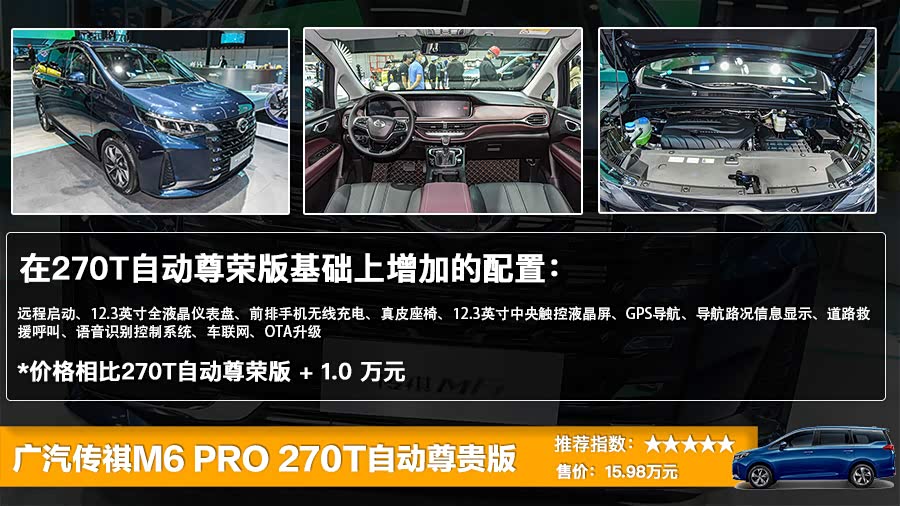 从性价比角度来看,传祺M6 PRO的这四款车型,售价为14.98万元的270T自动尊荣版性价比最高。