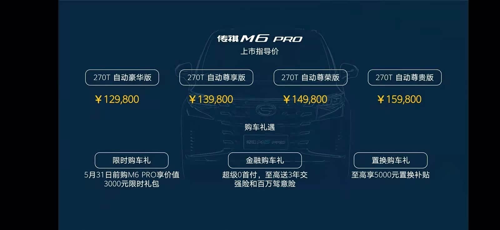 2021年5月1日,广汽传祺正式宣布,旗下的传祺M6 PRO车型正式上市,新车共推出四款车型,分别是270T自动豪华版、270T自动尊享版、270T自动尊荣版和270T自动尊贵版,售价区间为12.98万至15.98万元。新车作为一款中期改款车型,在外观和内饰方面都有所升级,全系均搭载1.5升涡轮增压发动机。