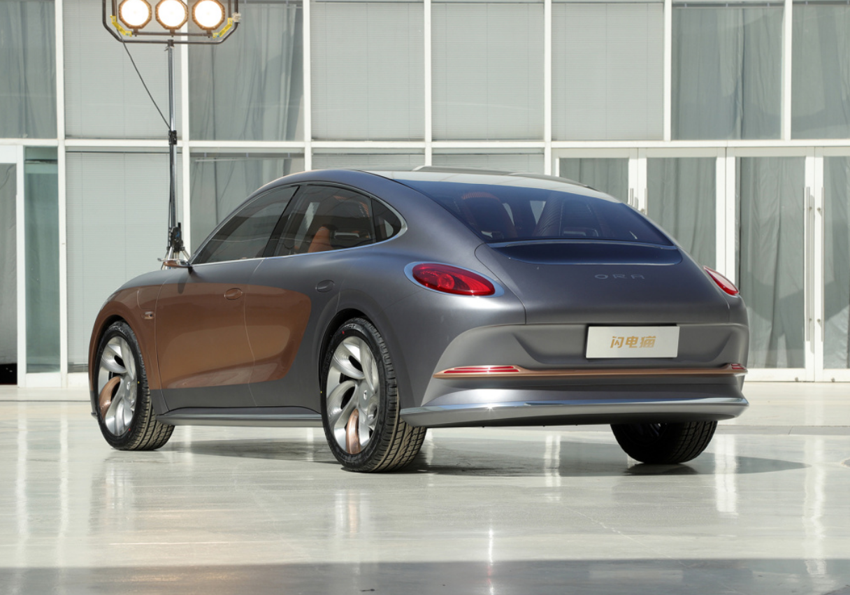 车身侧面很修长,虽然长宽高三围尺寸还没有给,不过已经确定轴距将达到2.8米级别,也就是说这是一台中型轿跑产品,所以即便采用了大溜背车顶,后排乘客头部空间依然是有保障的,尾部直接采用了一体成型超大玻璃车顶,这样的设计反而超越了保时捷,不过仔细看尾部线条还是有保时捷的味道。