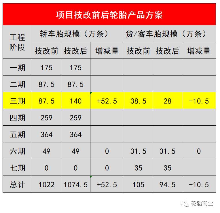 本项目投资总额:9350 万元,其中环保投资 100 万元。 拟使用现有厂房实施生产线产品结构调整技术改造,将部分生产卡客车轮胎设备改造为生产高性能轿车子午线轮胎(吸音海绵轮胎),轮胎规格为16-20英寸。更新密炼机、成型机等设备,新增激光打磨机、海绵贴附机等设备,在用胶量不增加的情况下,由全厂生产 1127 万条轮胎变为年产 1169 万条。 本次技改主要针对现有三期轮胎项目产品方案进行调整,技改前后轮胎产品方案见下表。