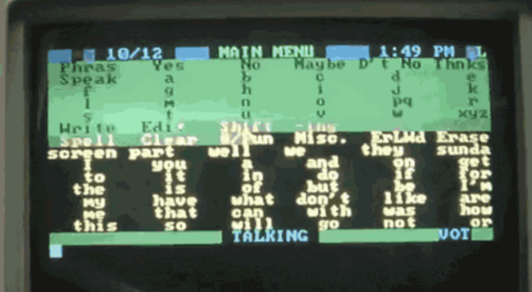这个程序说白了就是“单词拼写器”,但不同的是,这个程序的操作方式非常简单,只需要一两个按键。光标会一行一行扫过屏幕上显示的字母表,霍金只需要在光标经过想表达的字母时,给电脑一个确认指令便能实现输入。