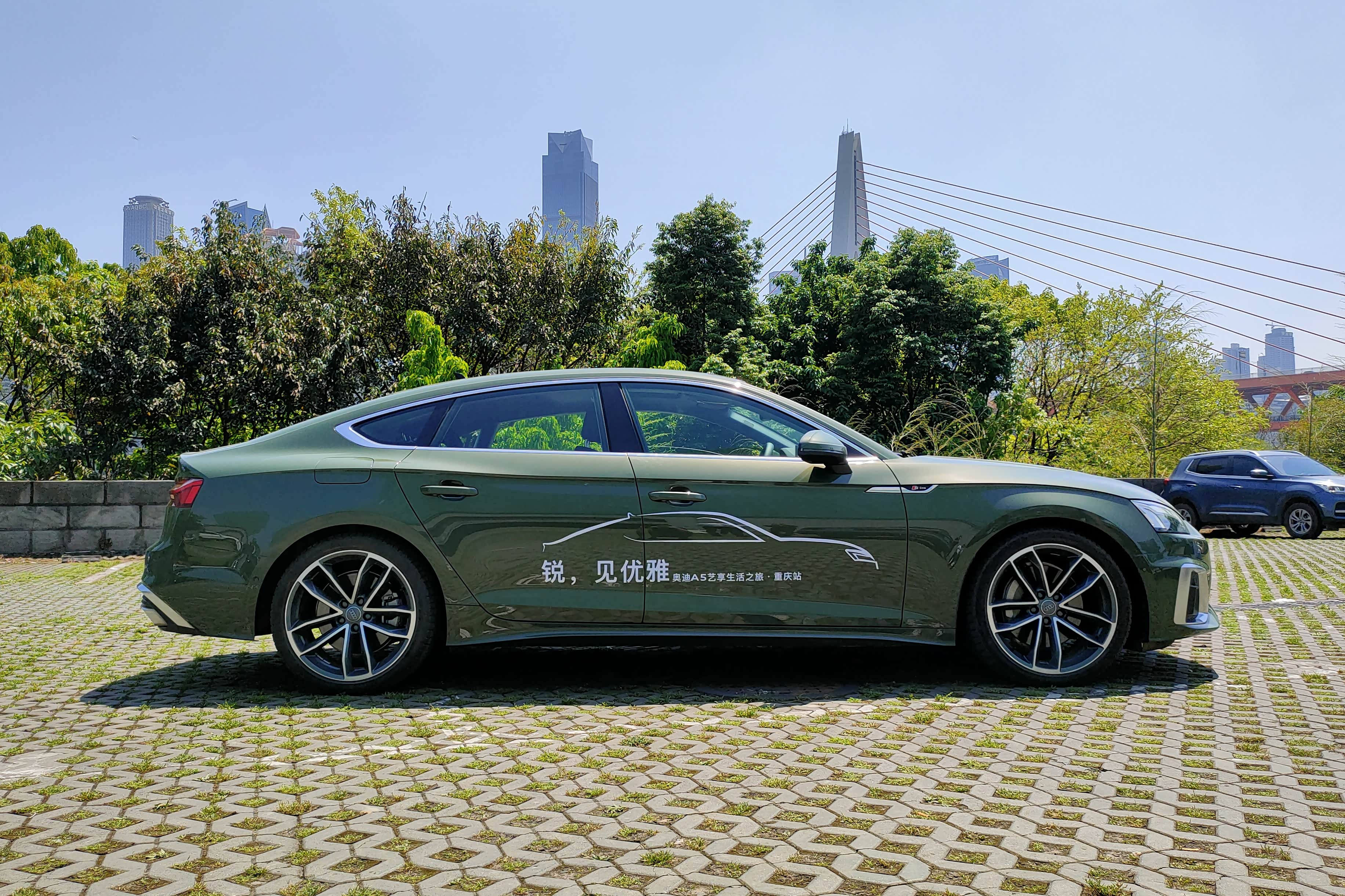 车身侧面是奥迪A5 Sportback的精髓所在,车顶线条一气呵成,标准轴距好似没有一丝赘肉,无框车门更是让人爱不释手。