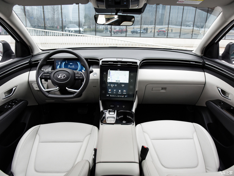 相比之前一代,全新第五代途胜L使用了全新的内饰设计。环抱式T型中控台搭配两块高精度液晶显示屏,同时白色为主的双色的配色让整车内饰显得简洁时尚,素雅中又不缺科技感。