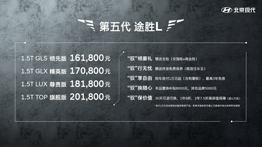 全新第五代途胜L一共有四款车型,分别是161800元的GLS领先版、170800元的GLX精英版、181800元的LUX尊贵版和201800元的TOP旗舰版。