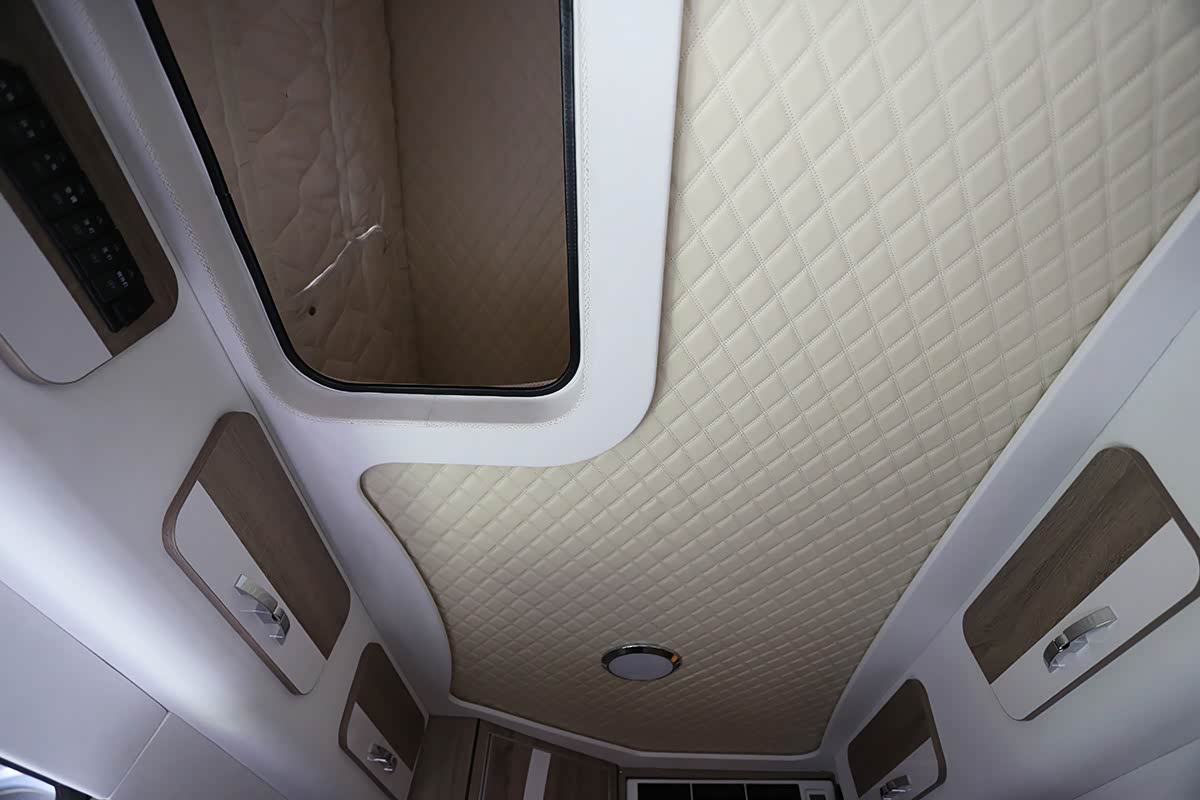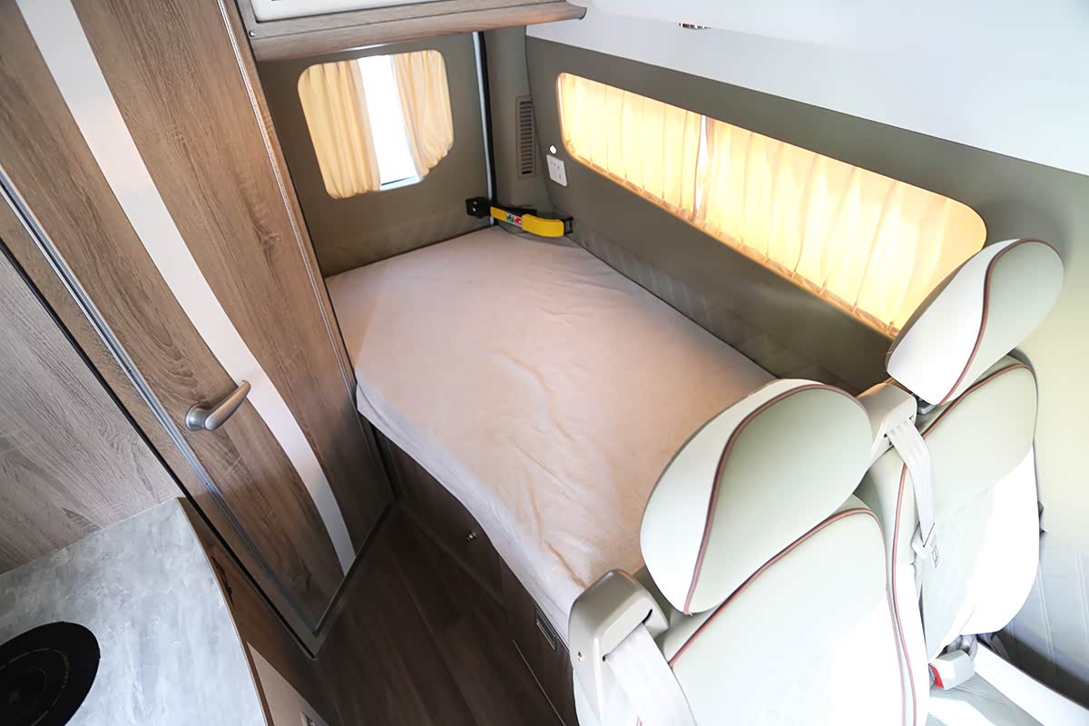 可以看到这款房车配备了电动升顶,平时行驶中收起升顶,可通过2米5的限高,停车露营的时候,升顶内部是1张双人床位。